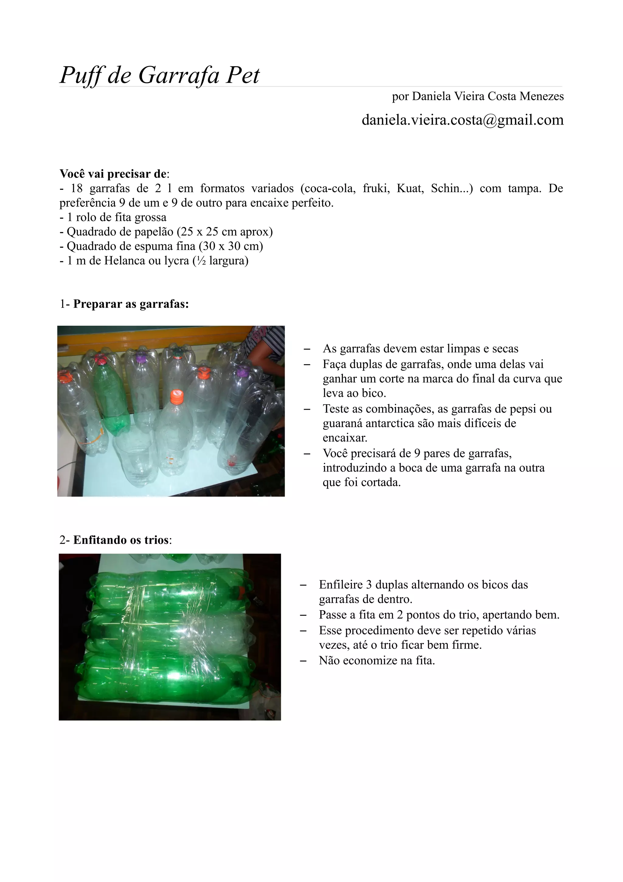 Este documento fornece instruções para fazer um puff de garrafa pet usando 18 garrafas PET vazias, fita, papelão e tecido. As etapas incluem preparar as garrafas em pares com um corte, juntar os pares em trios amarrados com fita, juntar os trios em uma estrutura amarrada com mais fita, e finalmente encapar a estrutura com papelão e tecido presos com fita.