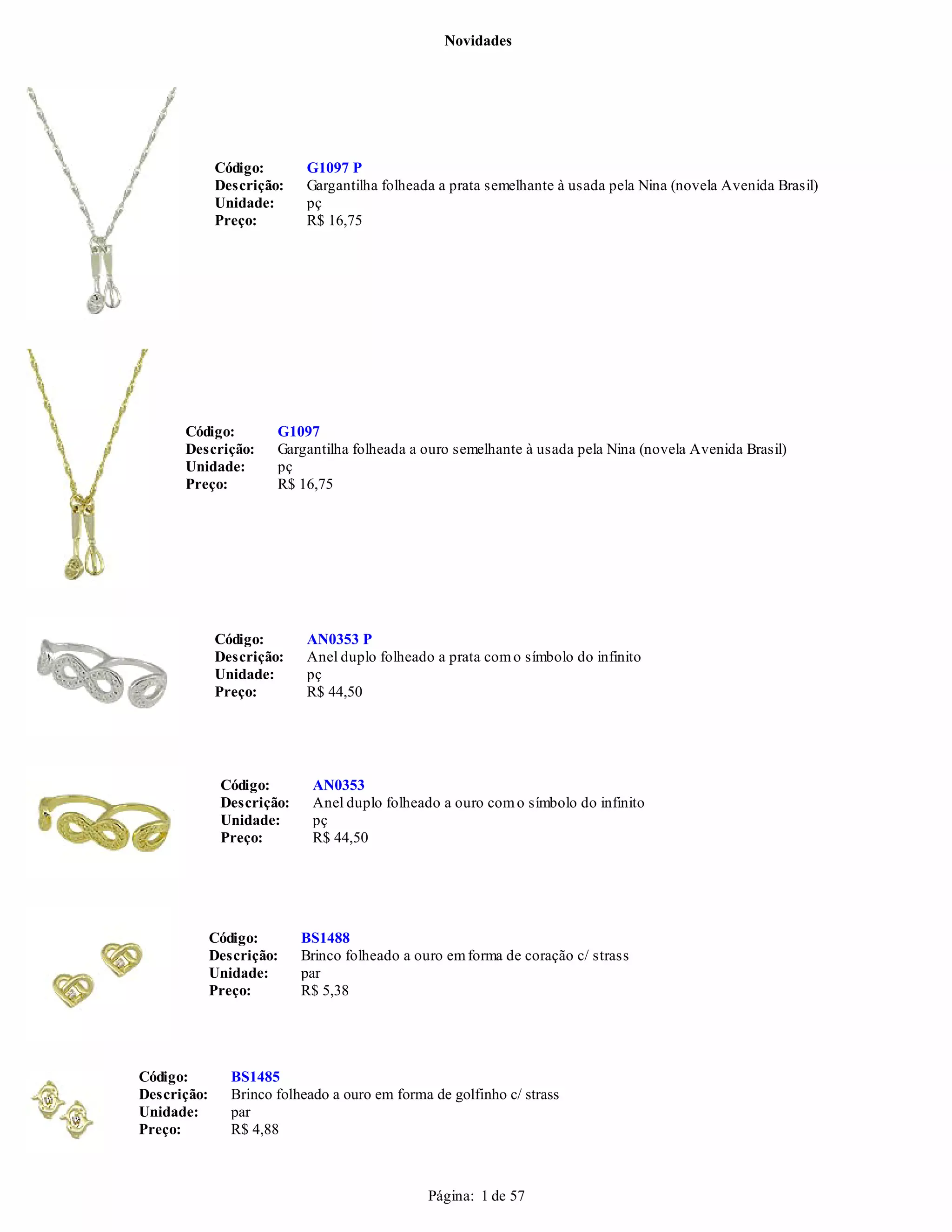 O documento lista produtos de joalheria como gargantilhas, anéis, brincos e tornozeleiras com seus respectivos códigos, descrições, unidades de medida e preços. A maioria dos itens são produzidos em prata ou ouro e contém pedras como strass. Os preços variam de R$2,38 a R$64,75 dependendo do material e detalhes de cada peça.