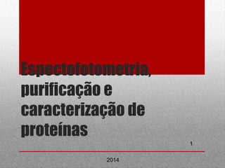 O documento discute espectrofotometria e métodos de purificação e caracterização de proteínas, incluindo a lei de Lambert-Beer, espectrometria de absorção atômica, diálise, cromatografia em coluna, cromatografia de troca iônica, cromatografia de afinidade, HPLC e eletroforese. Vários métodos geralmente precisam ser usados sequencialmente para purificar completamente uma proteína com base em diferentes propriedades.
