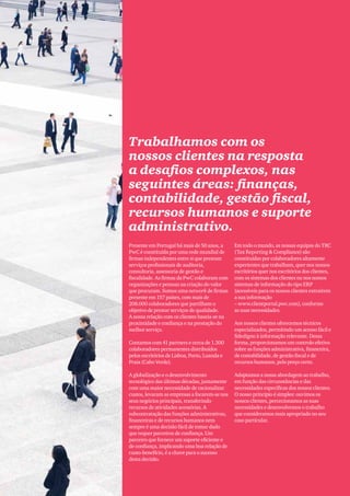 O documento descreve os serviços de outsourcing de finanças, contabilidade, gestão fiscal e recursos humanos oferecidos pela PwC em Portugal, Angola e Cabo Verde, incluindo contabilidade e relatórios financeiros, cumprimento de obrigações fiscais, processamento de pagamentos e declarações, e suporte administrativo temporário.