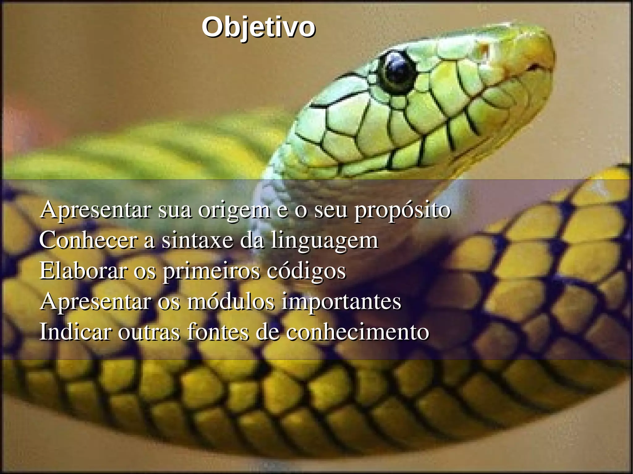 Este documento apresenta uma introdução à linguagem de programação Python, abordando sua origem, propósito, sintaxe básica, tipos de dados, controle de fluxo, funções, módulos, documentação e tratamento de erros. O objetivo é fornecer os conceitos fundamentais para iniciar o desenvolvimento de códigos em Python.