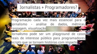 O documento discute como a programação se tornou essencial para o jornalismo moderno, permitindo a análise de dados, métricas e raspagem de sites para encontrar histórias. Ele fornece exemplos de scripts que foram transformados em histórias de interesse público e discute como a Escola de Dados capacita jornalistas e organizações da sociedade civil a usar dados de forma mais efetiva.