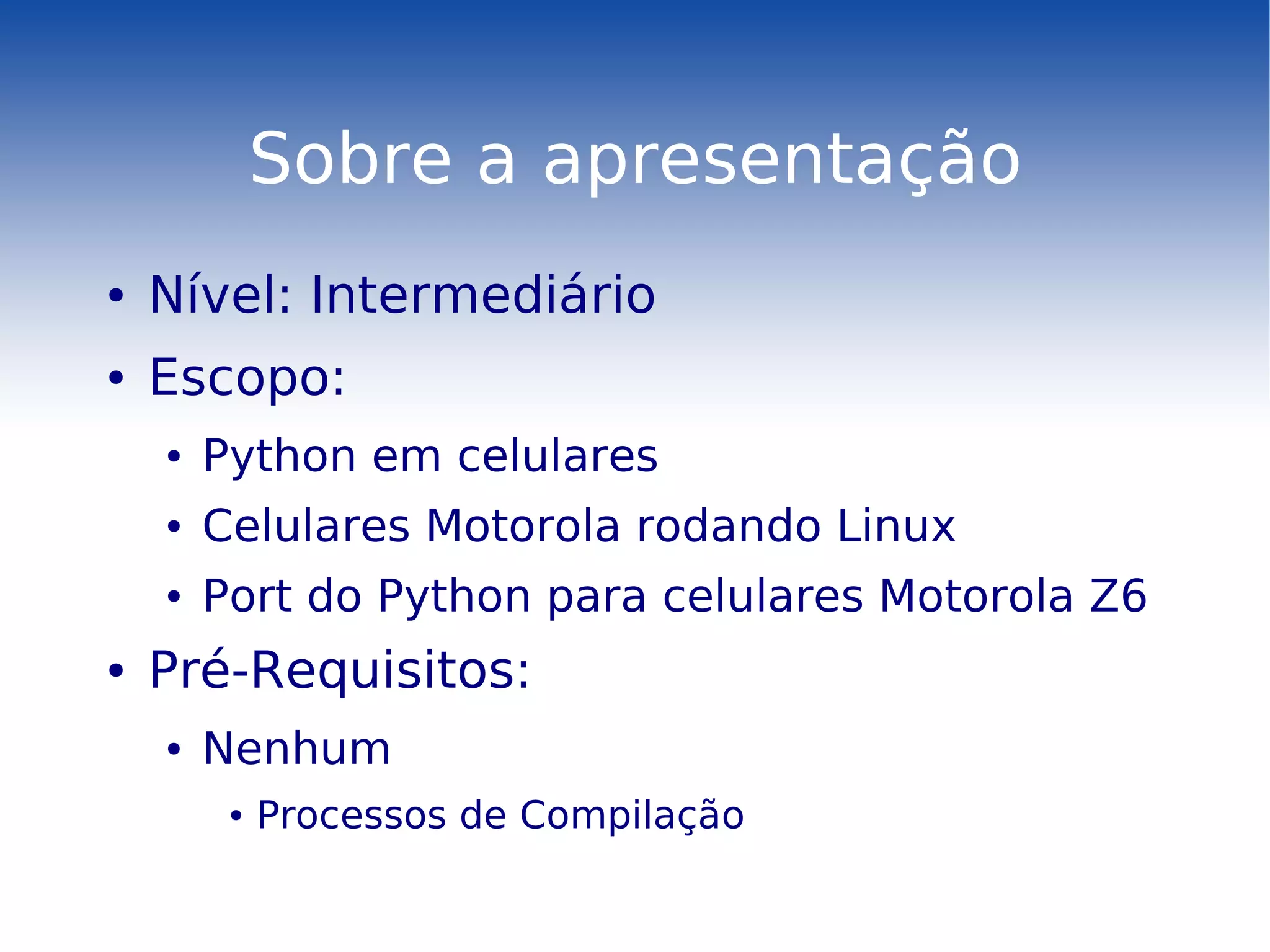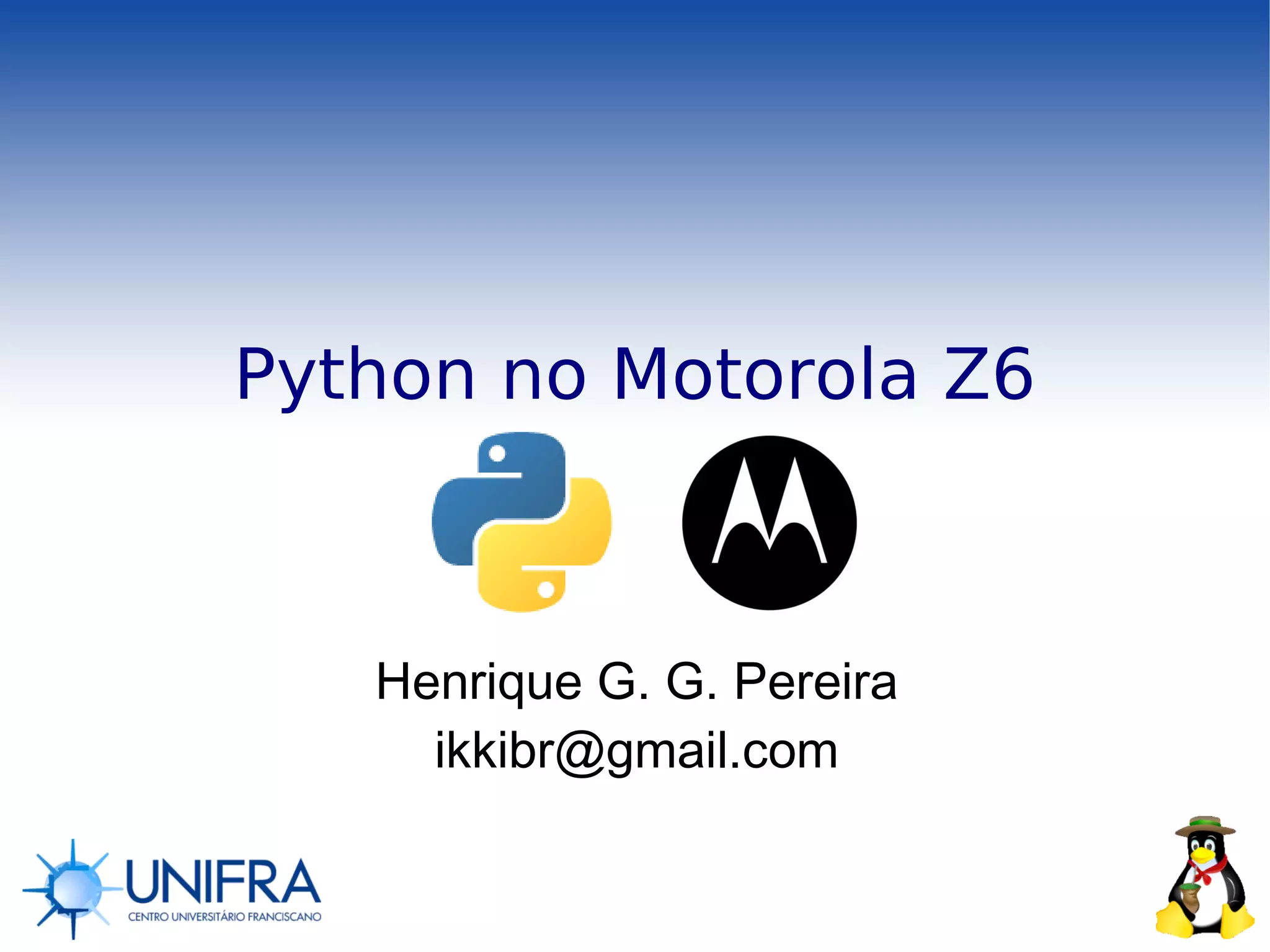O documento discute a portação do Python para o celular Motorola Z6 rodando Linux. Ele descreve o processo de compilação cruzada do Python para a arquitetura ARM do Z6, os problemas enfrentados como a falta de um compilador nativo e a dificuldade em importar módulos, e as soluções atuais como rodar o Python via telnet ou shell no próprio celular. O autor também lista trabalhos futuros como criar uma distribuição pública e melhorar o acesso e interface gráfica.