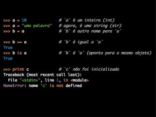 O documento discute a linguagem de programação Python. Resume os principais pontos como: (1) Python começou em 1991 e é uma linguagem de alto nível, multi-paradigma e multiplataforma; (2) Python preza pela legibilidade do código e usa tipagem dinâmica e forte; (3) Python tem uma biblioteca padrão extensa e suporte a programação funcional, orientada a objetos, concorrente e web.