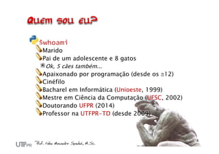 Marido, pai, apaixonado por programação e cinema. Bacharel em Informática e Mestre em Ciência da Computação leciona na UTFPR-TD e está cursando doutorado na UFPR.