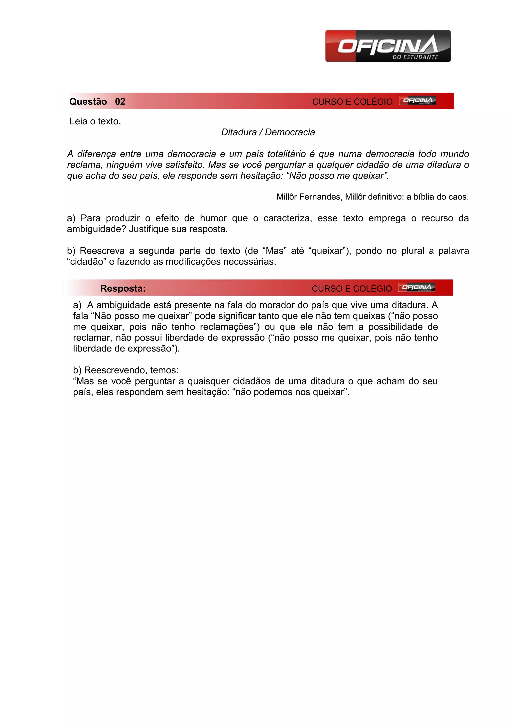 a) A ambiguidade está presente na fala do morador do país que vive uma ditadura. A