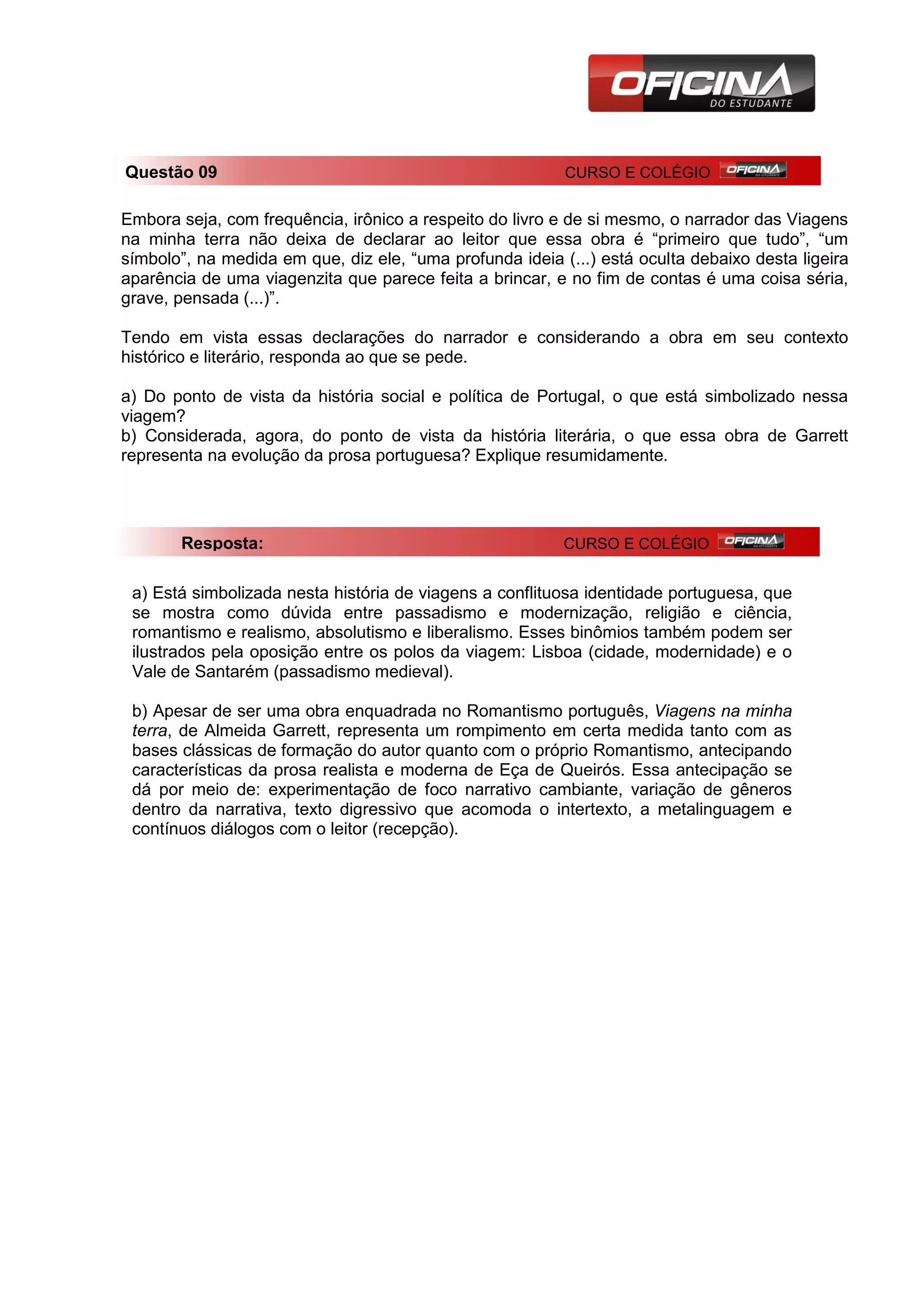 Neste resumo, o autor declara que a obra "Viagens na minha terra", de Almeida Garrett, é um símbolo que representa a conflituosa identidade portuguesa entre passado e modernidade. Literariamente, a obra representa uma ruptura com o Romantismo português, antecipando características da prosa realista moderna, por meio de experimentação narrativa e estilo digressivo.