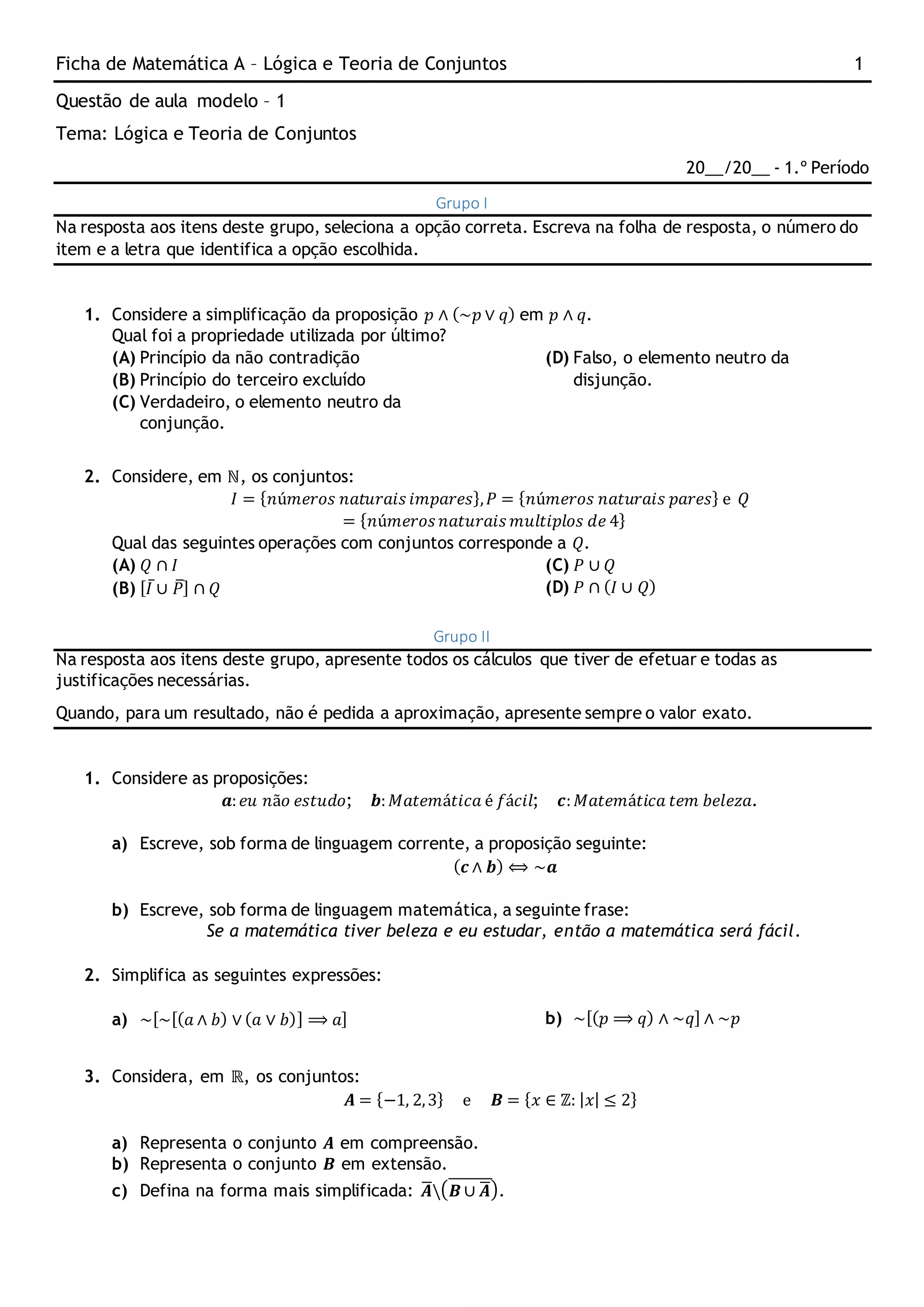 ![Ficha de Matemática A – Lógica e Teoria de Conjuntos 1