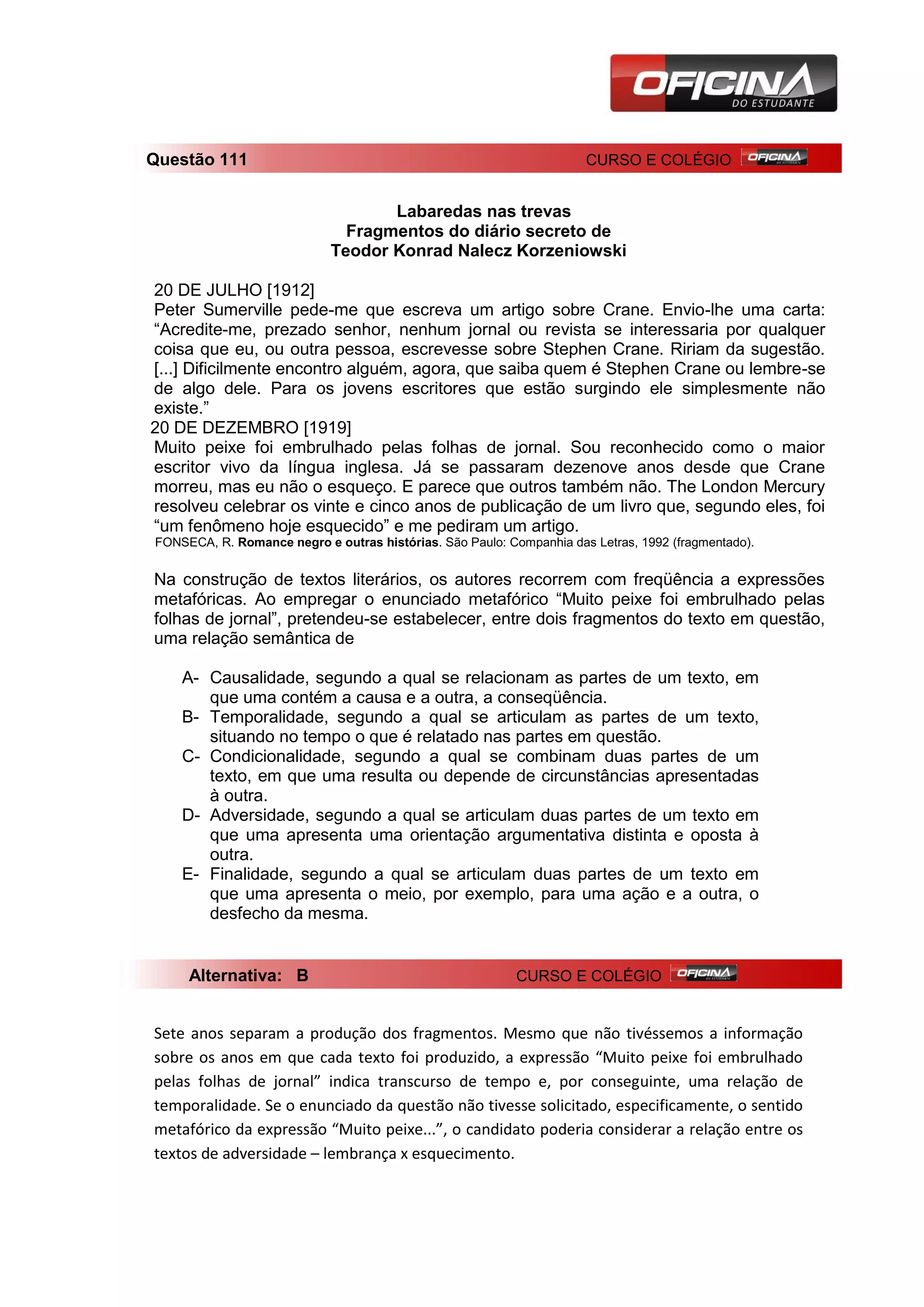O documento resume dois fragmentos do diário secreto de Teodor Konrad Nalecz Korzeniowski. No primeiro fragmento de 20 de julho de 1912, ele envia uma carta a Peter Sumerville recusando escrever um artigo sobre o escritor Stephen Crane, dizendo que ele é esquecido. No segundo fragmento de 20 de dezembro de 1919, ele nota que agora é reconhecido como o maior escritor vivo da língua inglesa e que Stephen Crane não é mais esquecido.