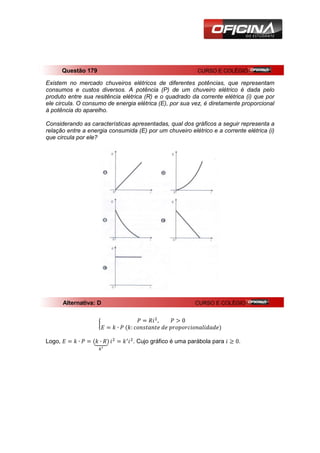 O documento discute a relação entre a energia consumida (E) por um chuveiro elétrico e a corrente elétrica (i) que circula por ele. Explica que a potência (P) de um chuveiro elétrico é dada pelo produto da resistência elétrica (R) e do quadrado da corrente (i). E também diz que o consumo de energia (E) é diretamente proporcional à potência. Portanto, a relação entre E e i é uma parábola.