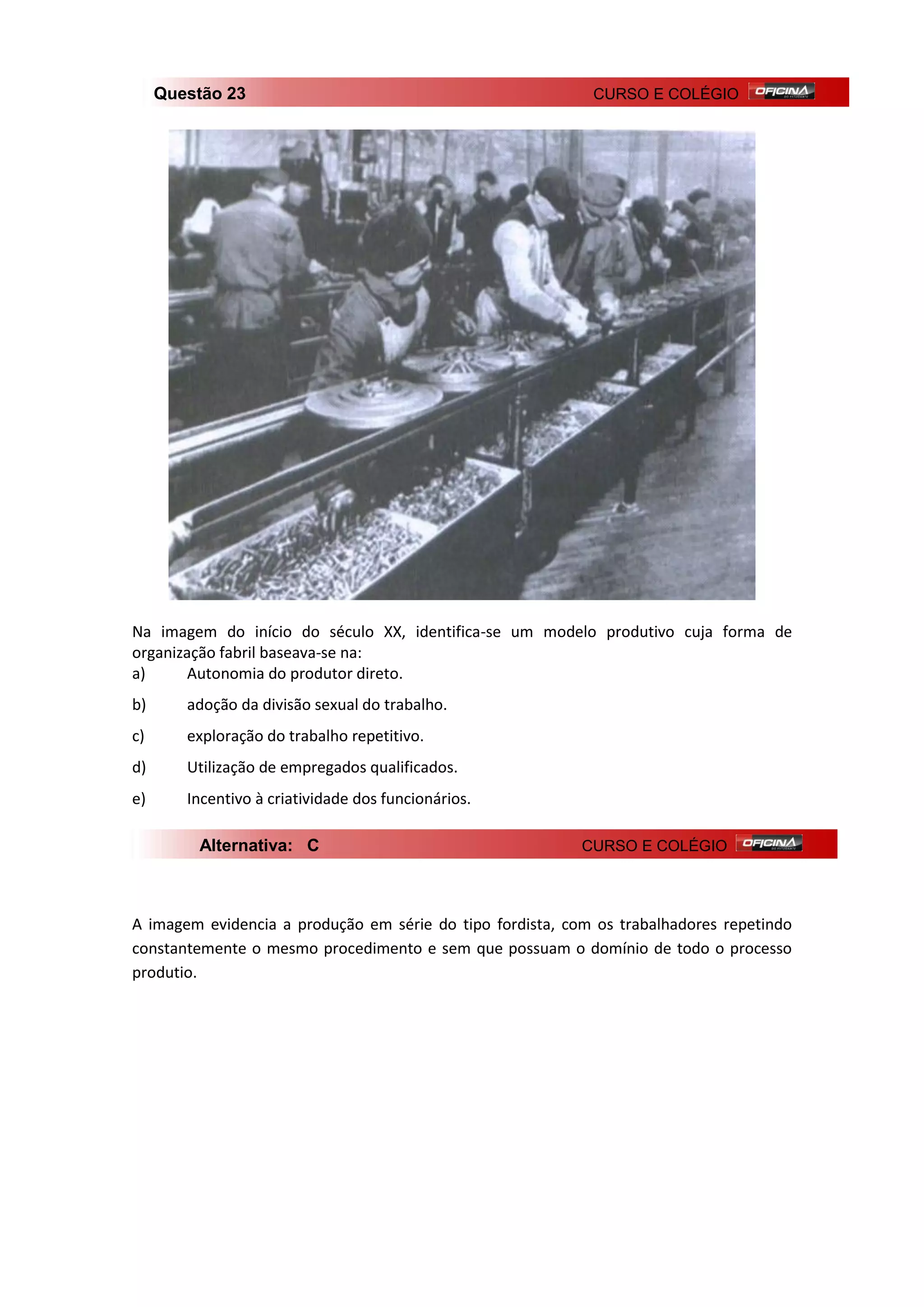 A questão pergunta sobre o modelo produtivo predominante no início do século XX e oferece cinco alternativas de resposta. A alternativa correta é a letra C, que afirma que esse modelo se baseava na exploração do trabalho repetitivo, como evidenciado pela imagem, que mostra trabalhadores repetindo constantemente as mesmas tarefas em uma linha de produção fordista.