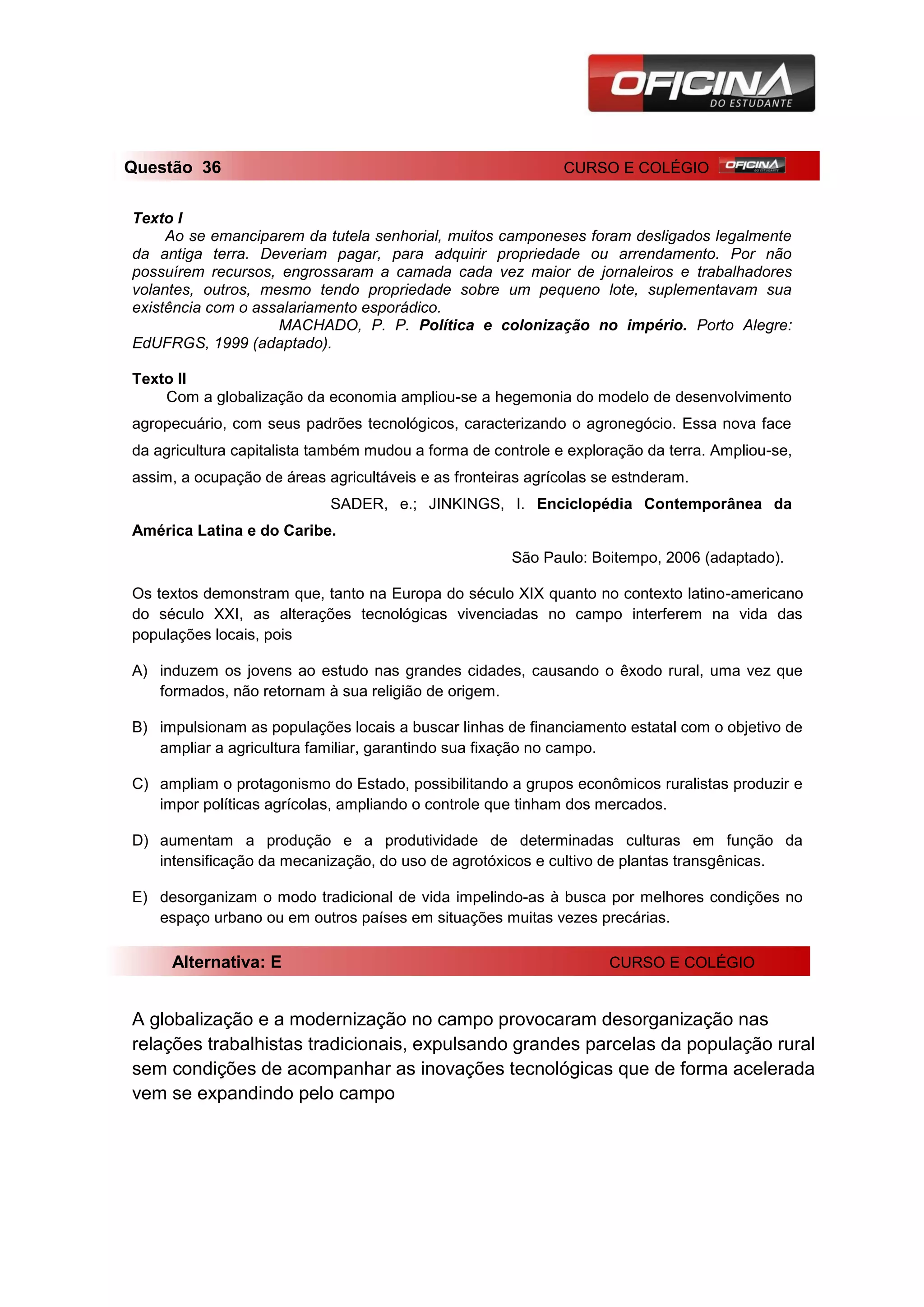 Os textos descrevem como a modernização agrícola no século 19 na Europa e no século 21 na América Latina desorganizaram as vidas das populações rurais, forçando muitos a se tornarem trabalhadores assalariados ou migrar para as cidades em busca de melhores condições de vida.