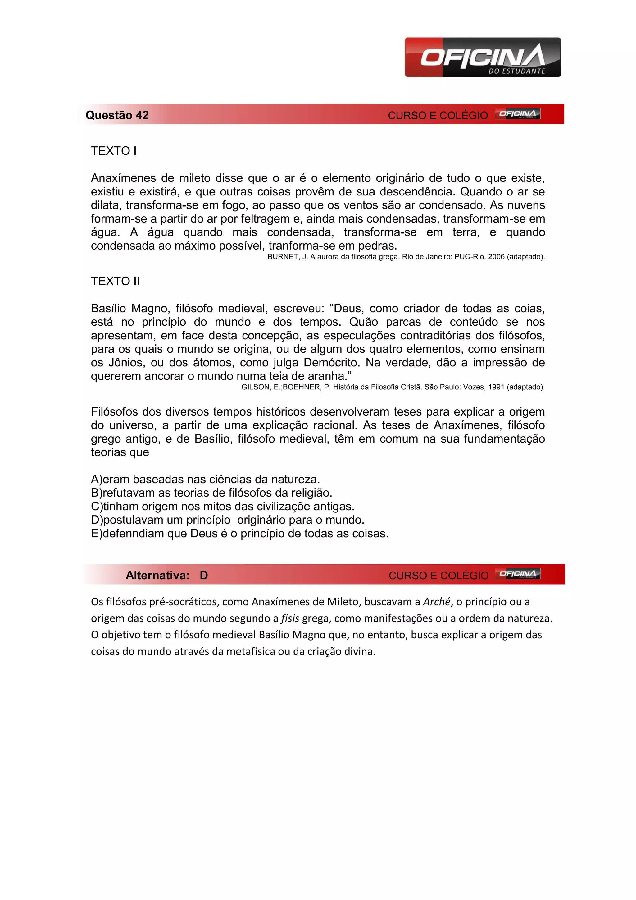 Alternativa: D CURSO E COLÉGIO