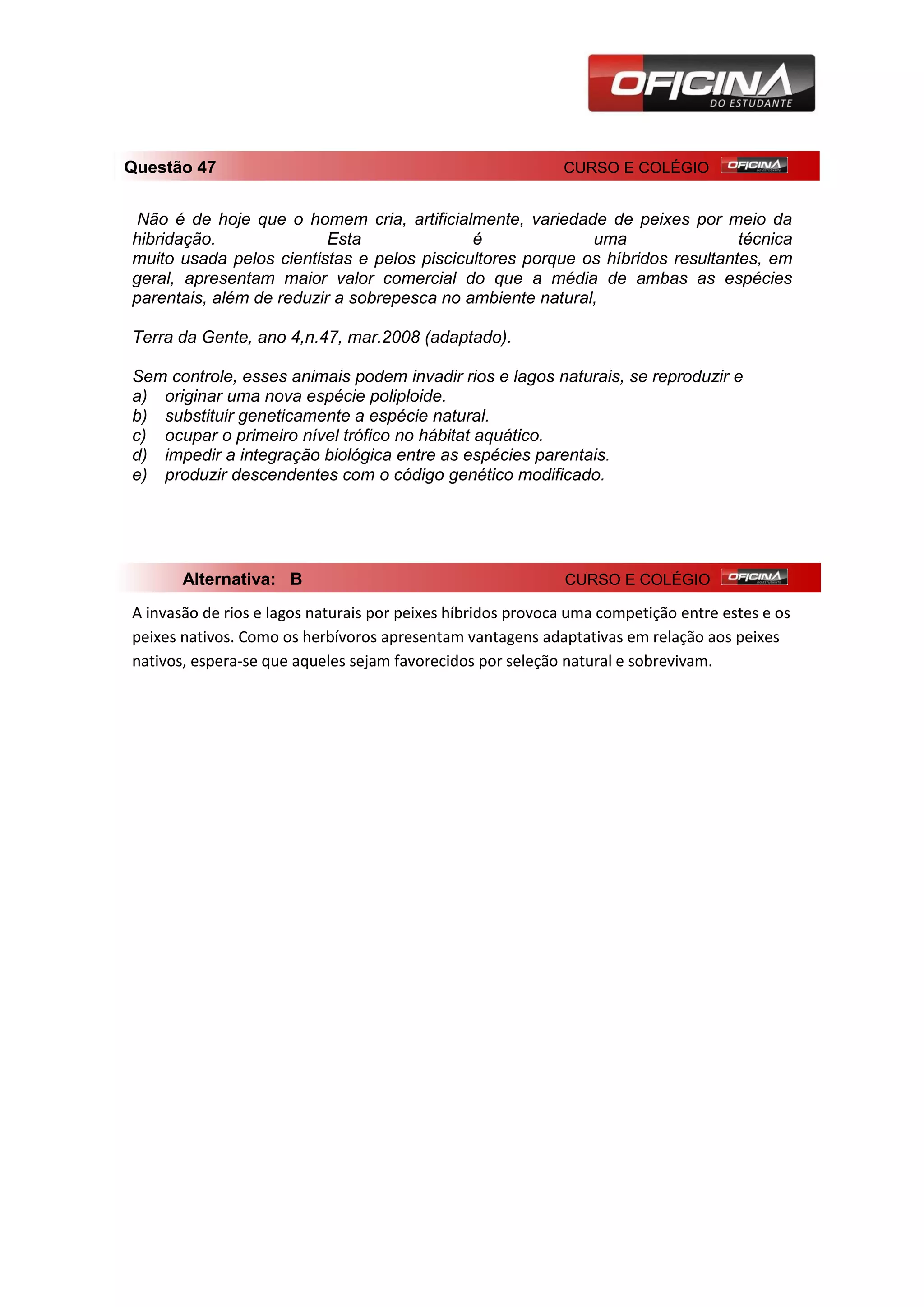 O documento discute a hibridação artificial de peixes por cientistas e piscicultores, que resulta em peixes híbridos com maior valor comercial e redução da sobrepesca. Sem controle, esses peixes híbridos podem invadir rios e lagos naturais e substituir geneticamente as espécies nativas através de seleção natural.