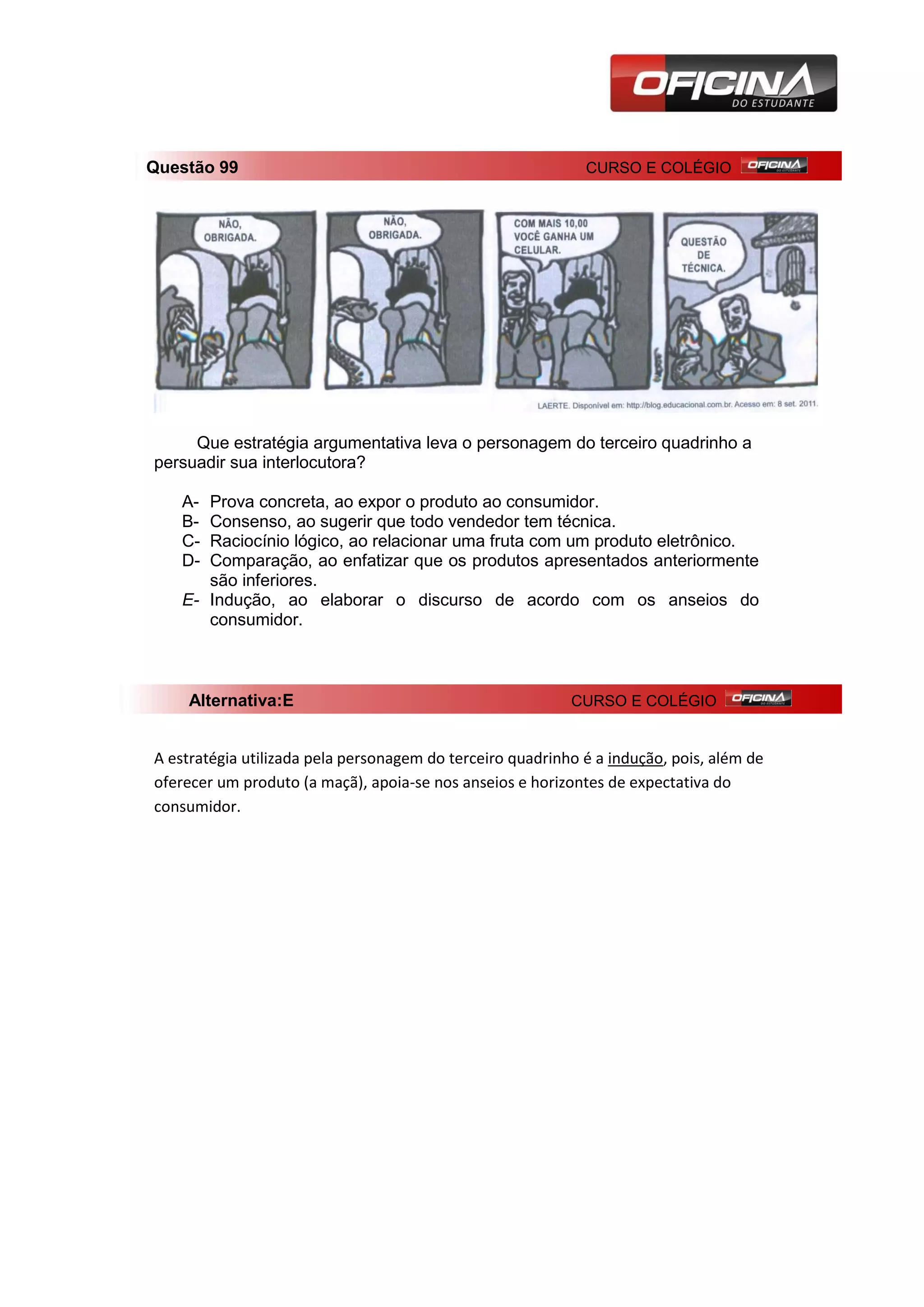 O documento discute a estratégia argumentativa usada por uma personagem em um quadrinho para persuadir outra pessoa. A personagem usa a estratégia de indução, elaborando seu discurso de acordo com os desejos do consumidor e oferecendo um produto que atende suas expectativas. A alternativa correta é a E.