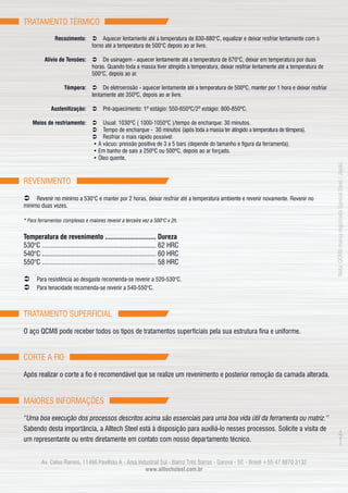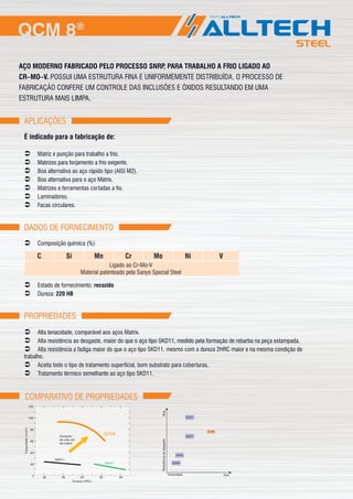 O documento descreve um aço fabricado pelo processo SNRP chamado QCM8, ligado ao Cr-Mo-V, com estrutura fina e uniforme, indicado para matrizes e ferramentas de trabalho a frio. O processo de fabricação confere controle de inclusões e óxidos, resultando em alta tenacidade e resistência ao desgaste comparável ao aço Matrix.