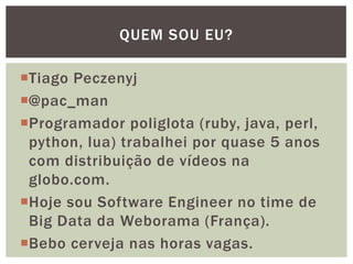 Tiago Peczenyj apresenta sobre propaganda na web, incluindo técnicas como retargeting, real time bidding e uso de big data para segmentar audiências e melhorar a performance de campanhas online. Ele também discute desafios de escalabilidade em sistemas de publicidade e ferramentas como Redis e Riak para armazenamento e processamento de grandes volumes de dados.