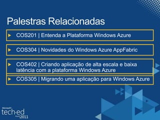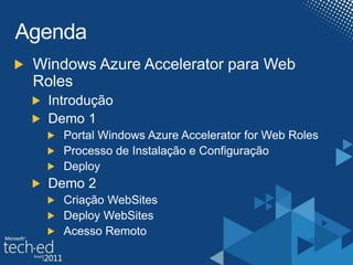 Este documento fornece links para recursos sobre Windows Azure Accelerator para Web Roles, incluindo documentação, laboratórios práticos e como baixar um aplicativo móvel gratuito. Além disso, pede para preencher uma avaliação online sobre uma conferência de tecnologia.