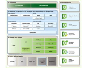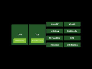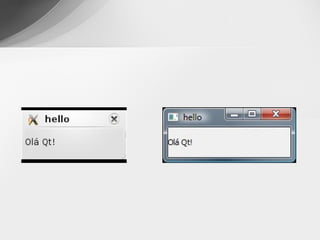 O documento discute o framework Qt, incluindo suas características, histórico, vantagens e módulos disponíveis. O Qt permite o desenvolvimento de aplicações multiplataforma e possui uma estrutura pronta para iniciar novos projetos.