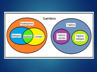 Um quadrilátero é uma figura plana formada por quatro pontos não colineares e os segmentos que os conectam. Os ângulos internos de um quadrilátero somam sempre 360°. Existem diferentes tipos de quadriláteros, como trapézios, losangos, retângulos e quadrados, classificados de acordo com a forma e propriedades dos lados e ângulos.