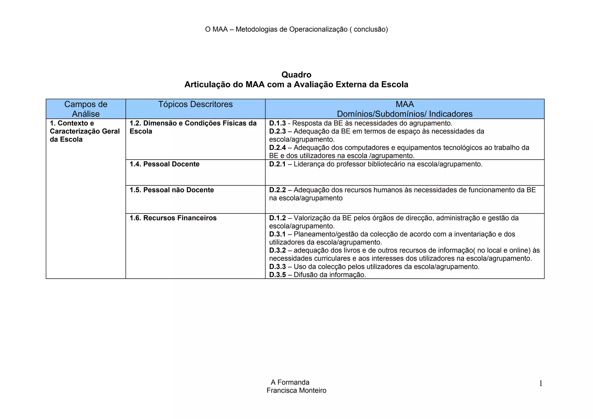 Este documento descreve como o MAA (Metodologias de Operacionalização) pode ser aplicado para avaliar bibliotecas escolares em 5 campos: 1) Contexto e caracterização da escola, 2) Projeto educativo, 3) Organização e gestão da escola, 4) Ligação à comunidade, 5) Clima e ambiente educativo. Fornece exemplos de como os domínios e subdomínios do MAA se relacionam com cada um destes campos.