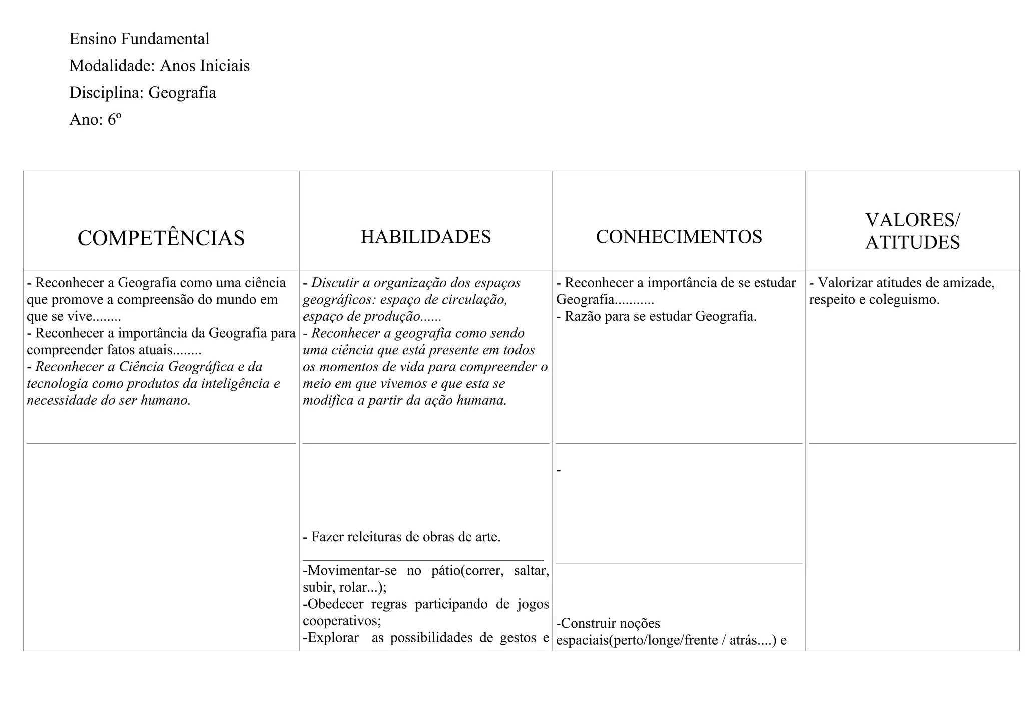 O documento apresenta informações sobre o 6o ano do ensino fundamental, disciplina de geografia. Ele descreve competências, habilidades, conhecimentos e valores/atitudes relacionados à matéria.