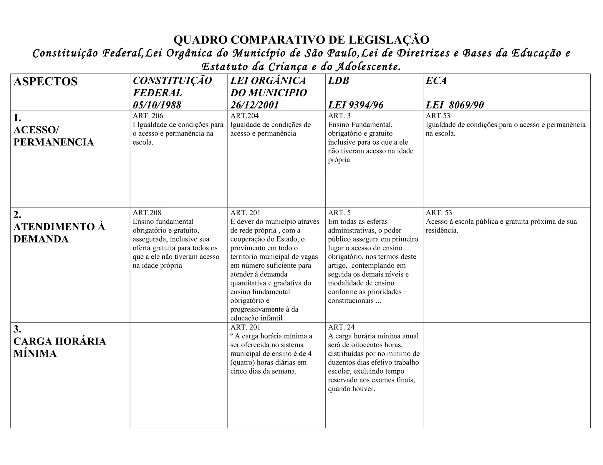[1] O documento compara aspectos da legislação educacional brasileira como a Constituição Federal, a Lei Orgânica do Município de São Paulo, a LDB e o ECA. [2] Aborda tópicos como acesso à educação, atendimento à demanda, carga horária mínima, constituição de grêmios estudantis, conselhos de educação, educação infantil, educação especial, ensino fundamental, superior e noturno. [3] Também discute planos educacionais, recursos, transporte escolar e uso de prédi