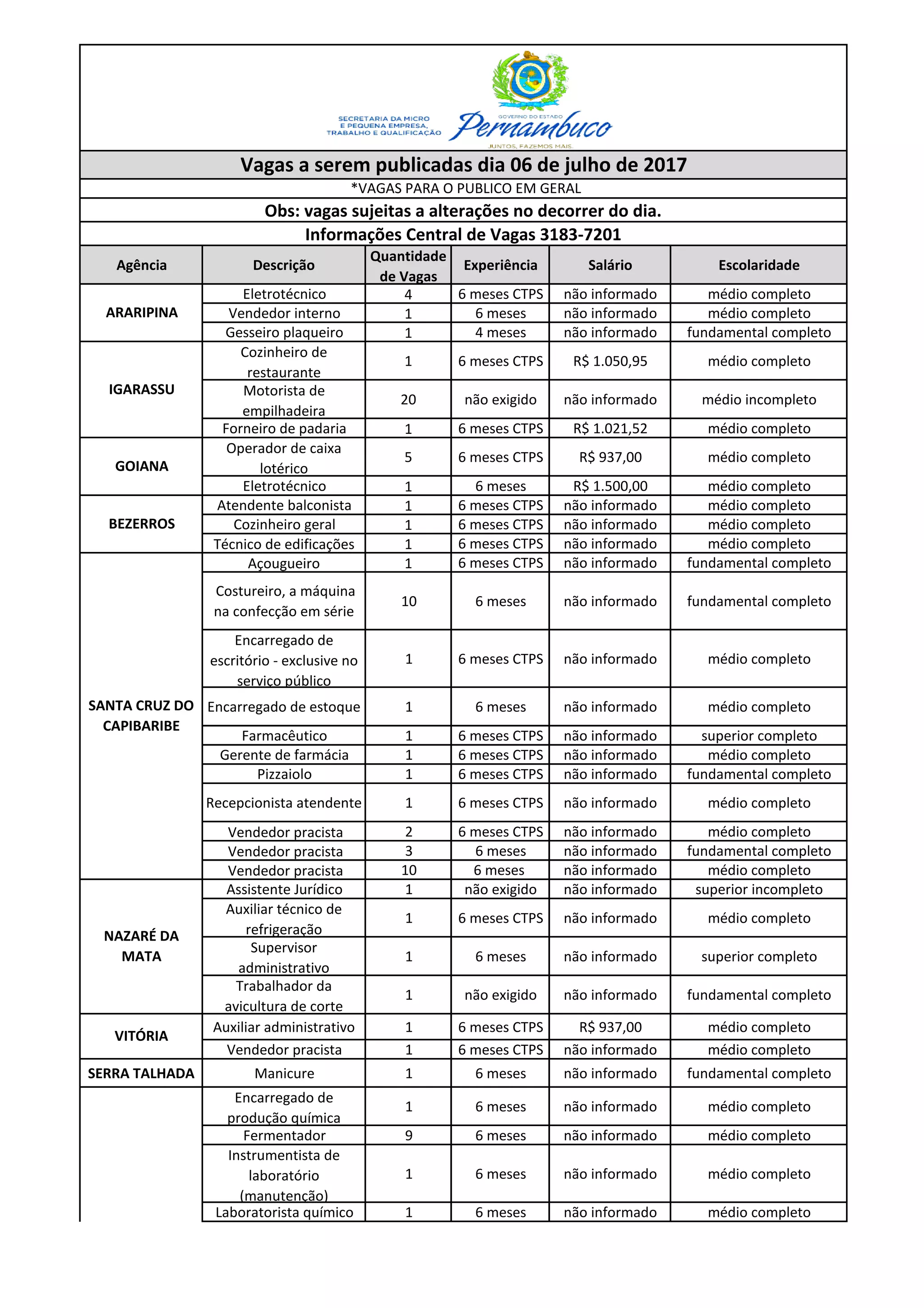 O documento lista 380 vagas de emprego em diversas cidades de Pernambuco, incluindo cargos como vendedor, operador, auxiliar, mecânico e outros. As vagas variam de 1 a 50 oportunidades e exigem de fundamental incompleto a superior completo, com salários de R$500 a R$1.600. Há também 120 vagas exclusivas para pessoas com deficiência.