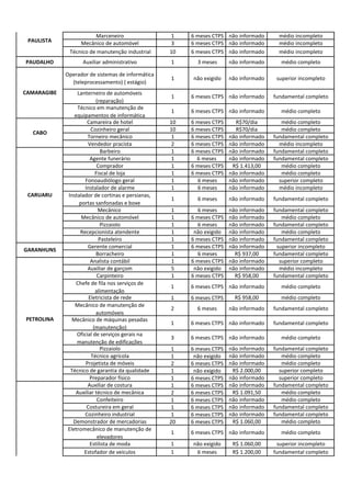 O documento lista 196 vagas de emprego em diversas cidades de Pernambuco, com cargos como atendente, vendedor, cozinheiro e auxiliar. As vagas exigem de fundamental incompleto a superior completo e experiência de 3 meses a 6 meses, com salários entre R$937,00 a R$2.200,00.