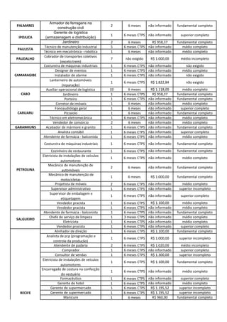 O documento lista 176 vagas de emprego em diversas cidades de Pernambuco. As vagas variam em termos de experiência necessária, salário e escolaridade exigida, incluindo cargos como auxiliar de prótese dentária, cozinheiro, motorista de ônibus, vendedor e técnico. A maioria das vagas exige no mínimo ensino médio completo e experiência de 6 meses.
