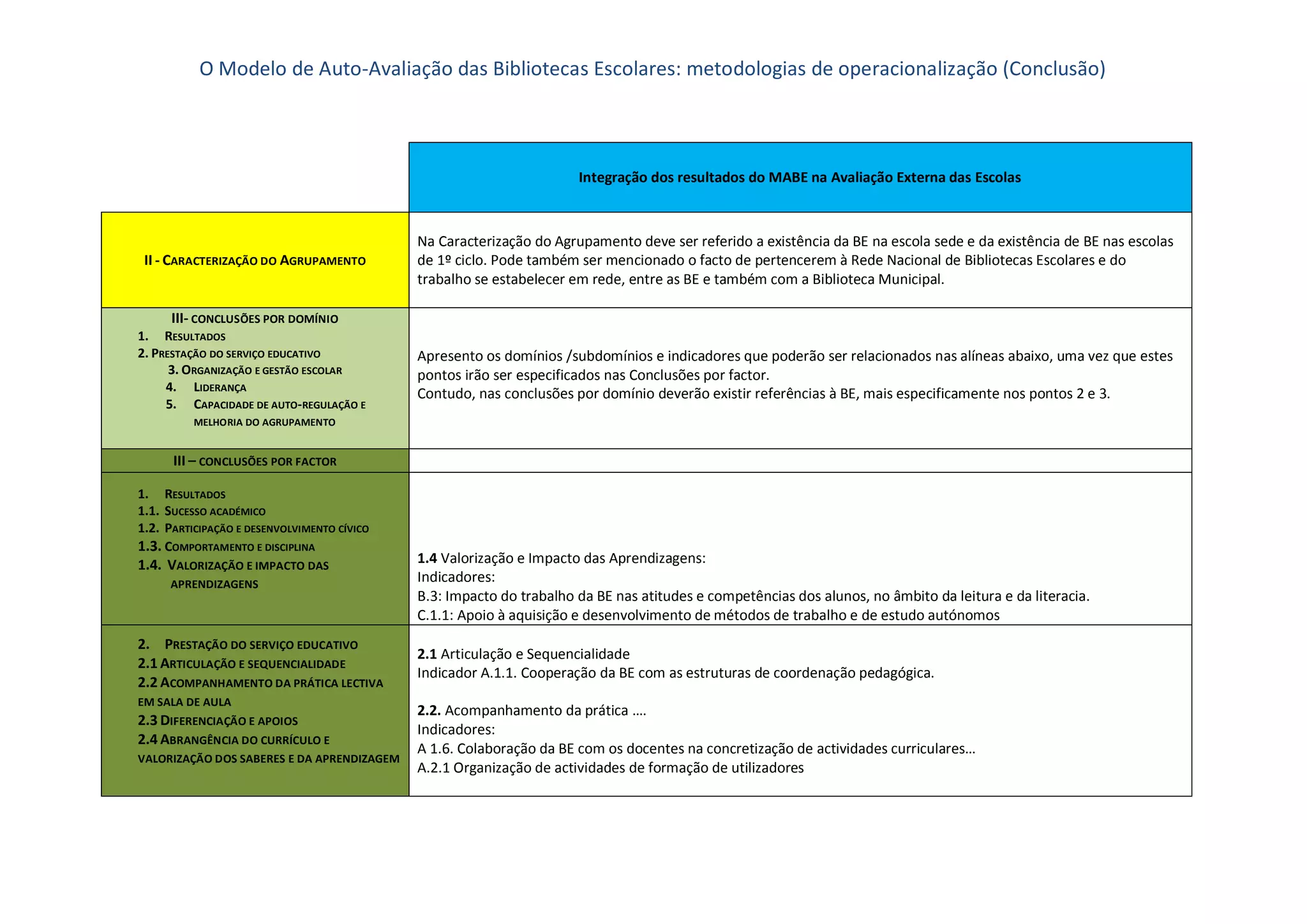 1) O documento discute a integração dos resultados do Modelo de Auto-Avaliação das Bibliotecas Escolares na avaliação externa das escolas.