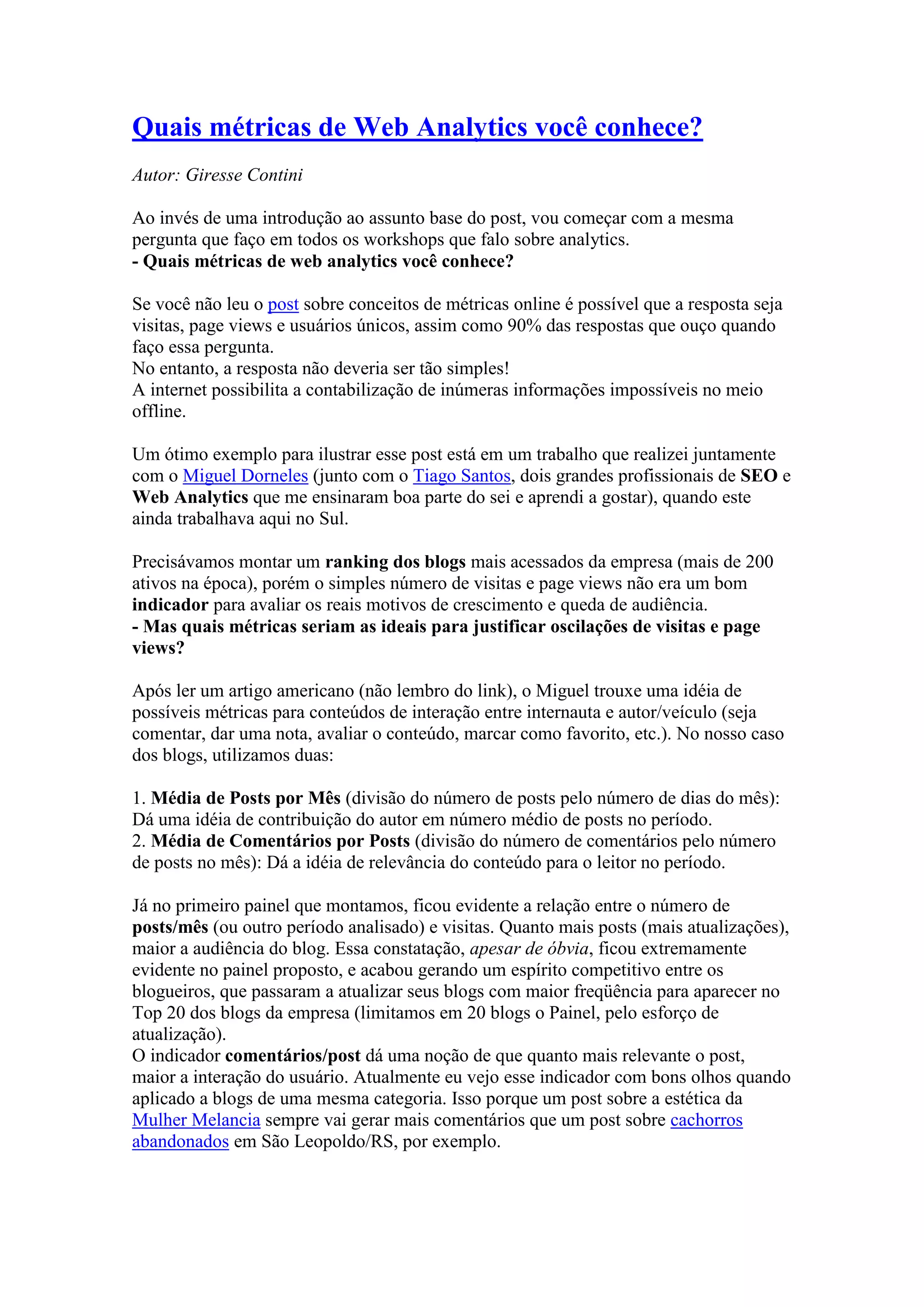1. O autor pergunta quais métricas de web analytics os leitores conhecem e afirma que as respostas geralmente são visitas, page views e usuários únicos.