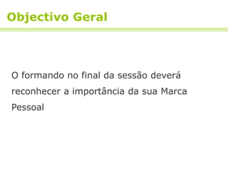 O documento explora a importância da marca pessoal e seus objetivos, enfatizando que ela deve ser desenvolvida através do marketing pessoal. Os formandos são incentivados a reconhecer suas unique características e objetivos, aplicando isso em um role play e respondendo a questões sobre o tema. Também apresenta estratégias para melhorar a comunicação, networking e diferenciação na construção da marca pessoal.