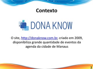 O documento descreve o processo de melhoria da usabilidade do aplicativo Dona Know através de inspeções de usabilidade e técnicas de design. A metodologia incluiu planejamento, análise de defeitos, coleta de feedback de usuários, e projeto de uma interface melhorada. O objetivo era entender melhor os usuários e identificar oportunidades para aprimorar a experiência no aplicativo.