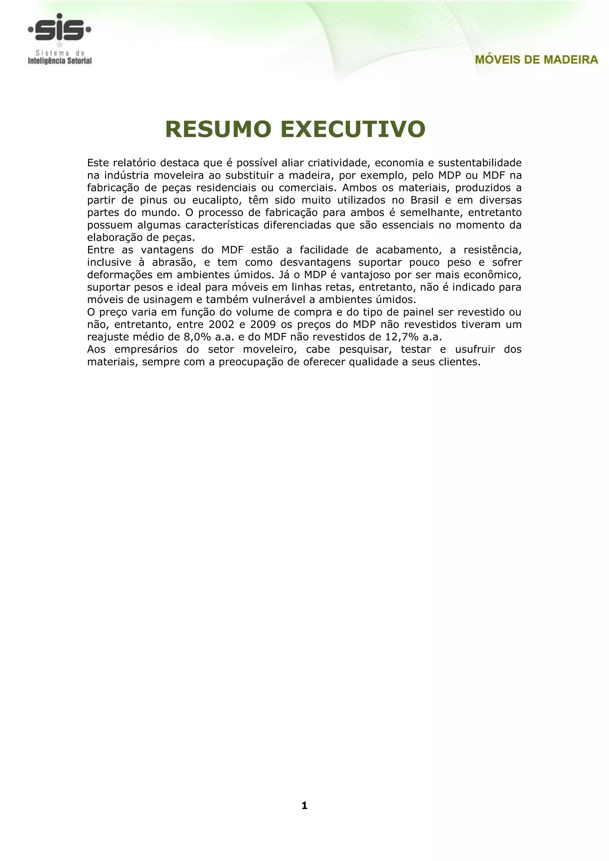 O relatório analisa a viabilidade da utilização de MDP e MDF na indústria moveleira, destacando características, vantagens e desvantagens de ambos. O MDF é recomendado para acabamentos elegantes, enquanto o MDP é mais econômico e resistente a pesos, mas menos adequado para usinagem. Ambos os materiais contribuem para a sustentabilidade ao serem fabricados com madeira de reflorestamento, sendo o MDP considerado mais ecológico devido ao menor consumo de madeira.