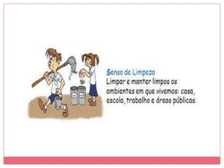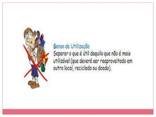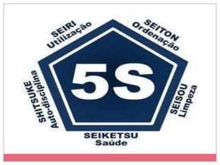 O documento discute os cinco princípios (5S) de organização e limpeza no ambiente de trabalho. Os 5S incluem: 1) Senso de Utilização - descartar itens desnecessários; 2) Senso de Ordenação - manter cada coisa em seu lugar; 3) Senso de Limpeza - manter o ambiente limpo; 4) Senso da Saúde e Higiene - criar um ambiente saudável; 5) Autodisciplina - aplicar constantemente os princípios. Ao aplicar os 5S, as empresas melhoram a qualidade