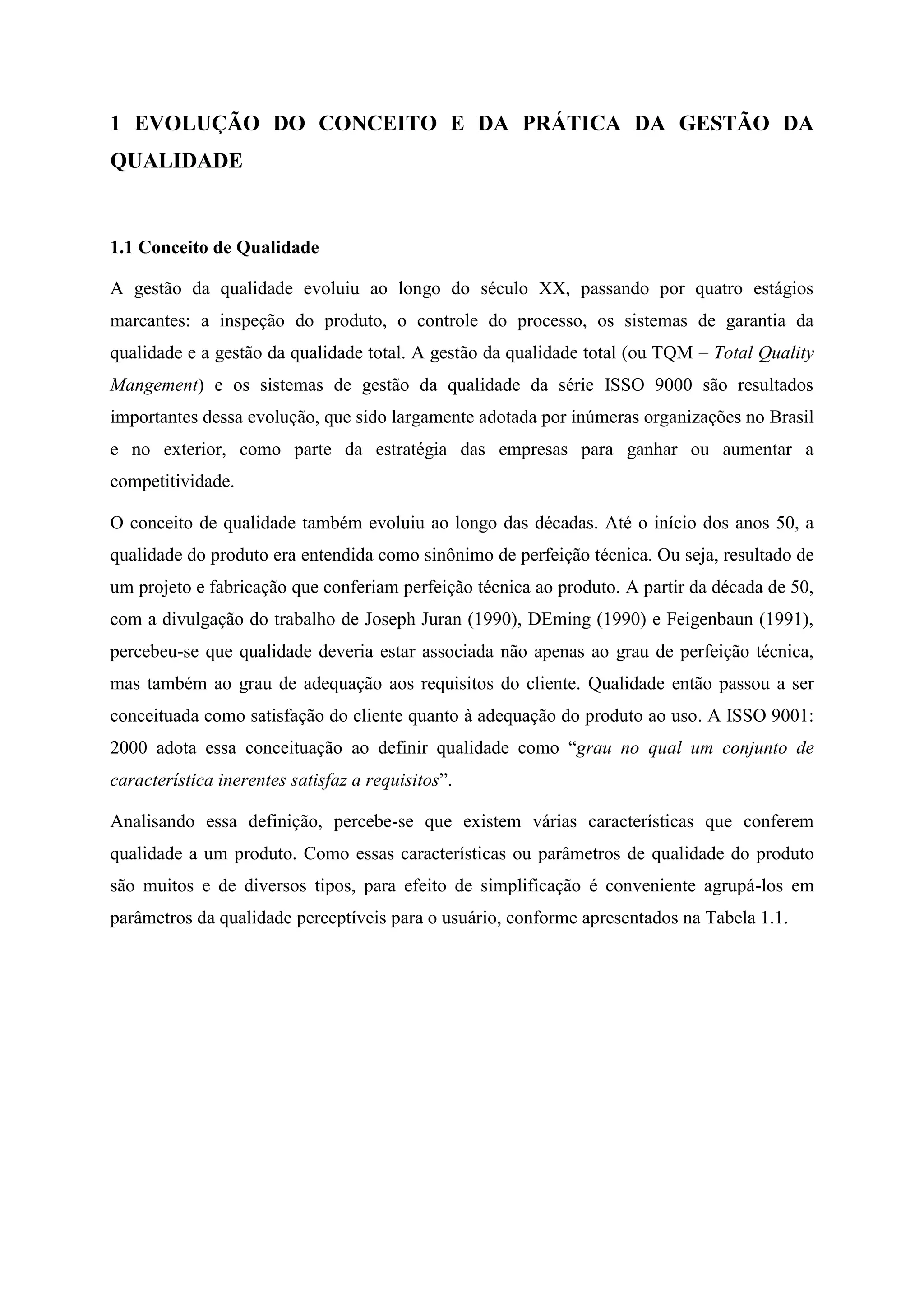 O documento discute a evolução do conceito e da prática da gestão da qualidade ao longo do século XX. Apresenta quatro estágios de evolução da gestão da qualidade: inspeção do produto, controle do processo, sistemas de garantia da qualidade e gestão da qualidade total. Também discute a evolução do conceito de qualidade e os princípios e requisitos dos sistemas de gestão da qualidade da série ISO 9000.