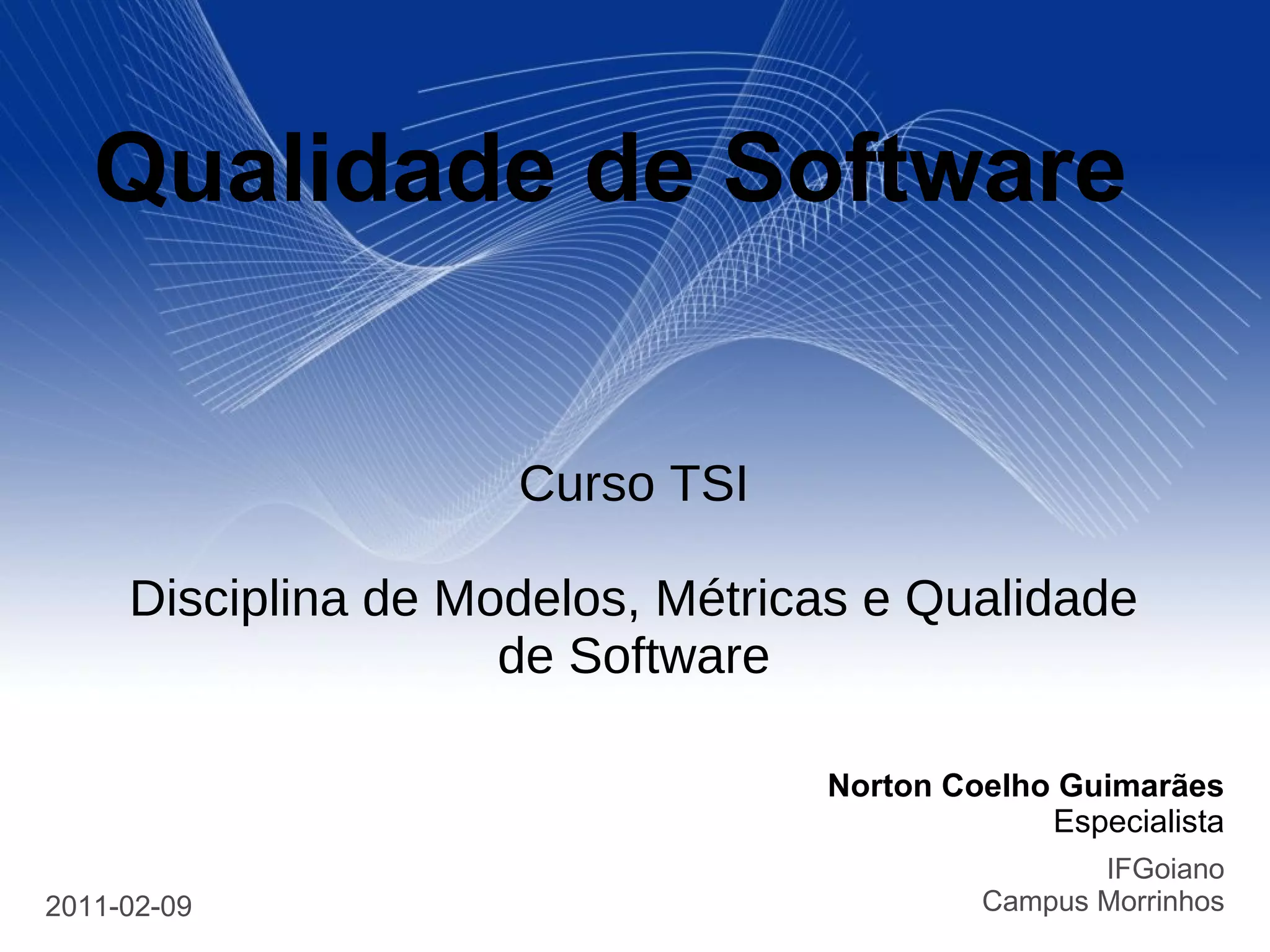 O documento discute o conceito de qualidade de software, definindo-o como a capacidade de um produto satisfazer as necessidades explícitas e implícitas dos usuários. Apresenta várias definições formais de qualidade, princípios e proposições relacionadas à qualidade de software, além de abordar a importância da certificação e dos padrões como a série ISO.