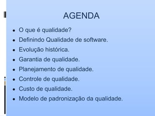 Este documento discute os conceitos e métodos de garantia de qualidade de software. Aborda tópicos como definição de qualidade, evolução histórica da garantia da qualidade, planejamento e controle de qualidade, custos associados e modelos de padronização como CMMI, ISO 9000 e ISO 9126.