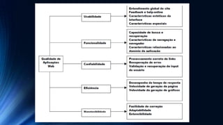 O documento discute uma metodologia para avaliar a qualidade de aplicações web ainda na fase de desenvolvimento através de cinco passos: 1) representação das características e atributos de qualidade, 2) especificação descritiva da árvore de características, 3) associação de pesos aos atributos, 4) associação de notas aos atributos, 5) cálculo geral. A metodologia permite identificar erros no início do processo e melhorar a qualidade do produto final.