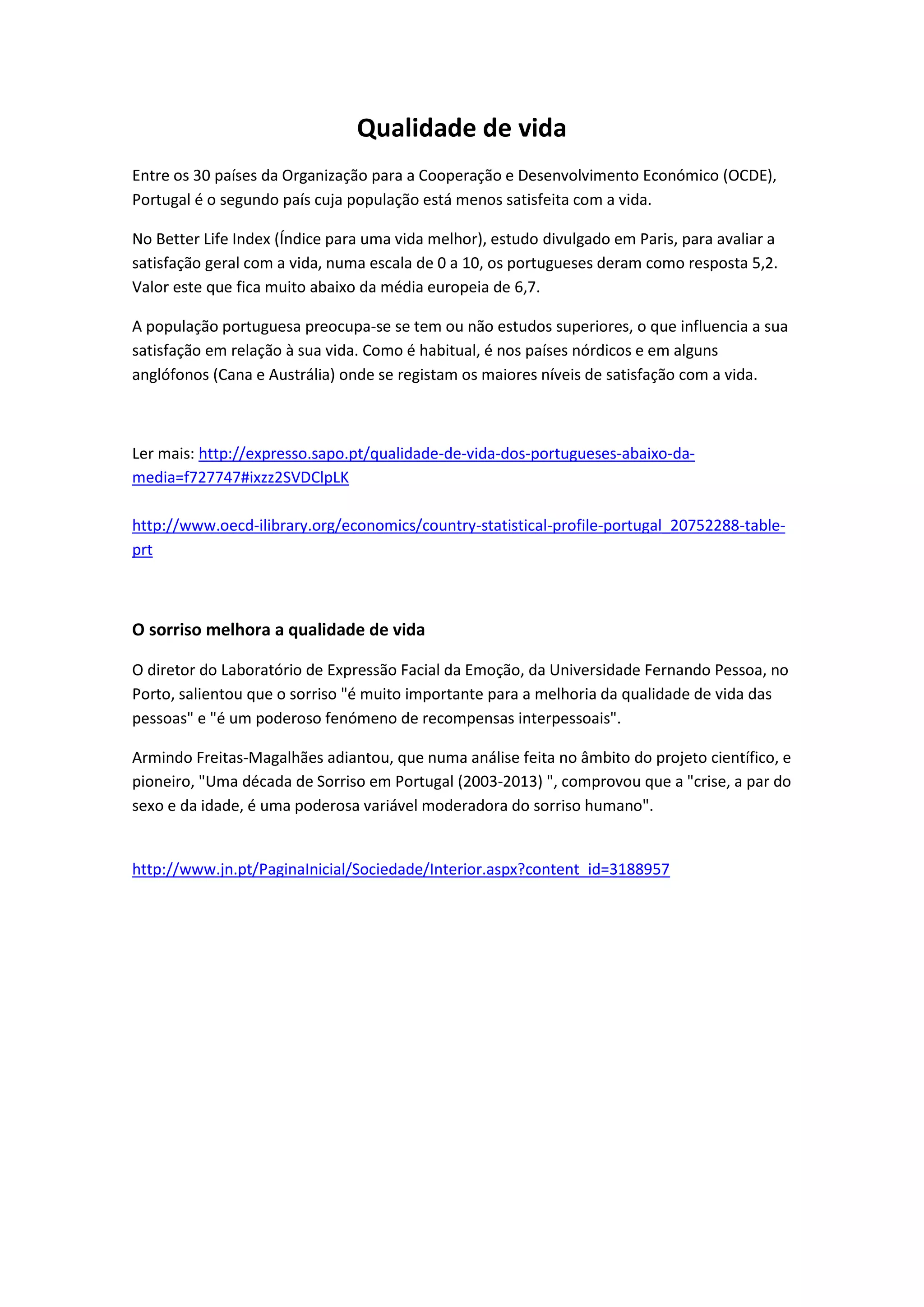 1) Os portugueses estão menos satisfeitos com a qualidade de vida do que a média europeia e dos países nórdicos.