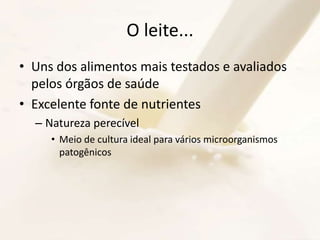O documento discute a qualidade do leite e do queijo, destacando a importância da higiene na ordenha, no acondicionamento e transporte do leite, e nas instalações de processamento para evitar doenças. Também aborda as exigências sanitárias para a comercialização de queijos artesanais feitos com leite cru.