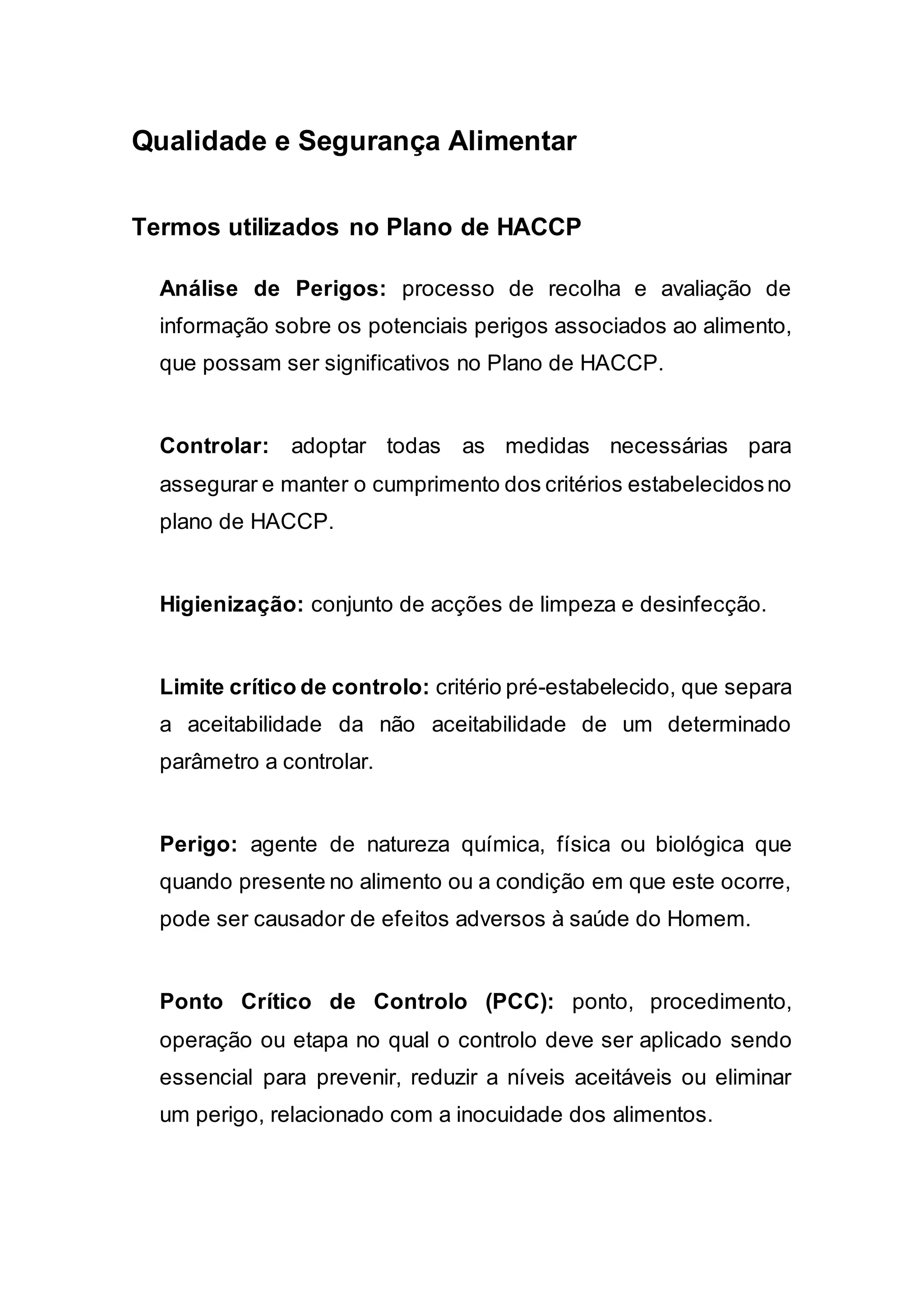 Este documento define termos-chave utilizados em Planos de HACCP para garantir a qualidade e segurança alimentar, incluindo análise de perigos, ponto crítico de controlo, limite crítico de controlo, perigo, e define o que é um Plano de HACCP e Sistema de HACCP.