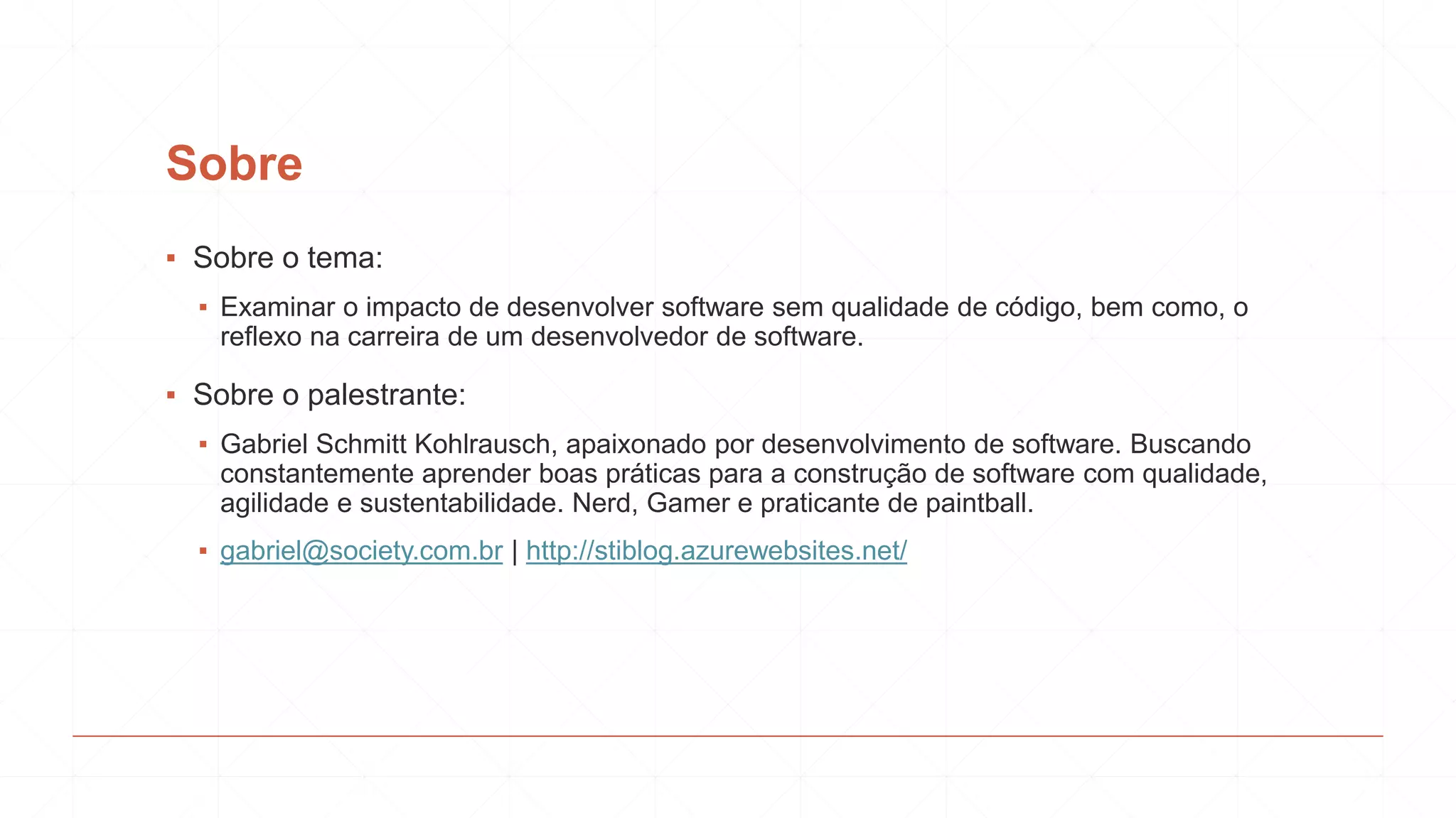 O documento discute a importância da qualidade no desenvolvimento de software, comparando-o com a construção civil. Ele argumenta que desenvolvedores acima da média se concentram em melhorar continuamente suas habilidades e produzir código limpo e sustentável através de práticas como refatoração e testes unitários. O documento também lista características desejáveis como iniciativa, cooperação e compartilhamento de conhecimento.