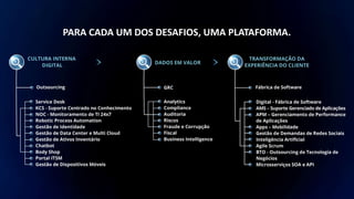 O documento descreve como o Grupo Quality pode ajudar empresas em suas jornadas de transformação digital, fornecendo serviços como suporte centrado em conhecimento, automação inteligente com robôs virtuais, serviço de atendimento digital 24/7, gestão de data centers e nuvem, análise de dados, experiência do cliente e soluções para padrões recorrentes de negócios. O Grupo Quality possui mais de 700 contratos ativos, 1400 colaboradores e centros de competência em 4 estados brasileiros.