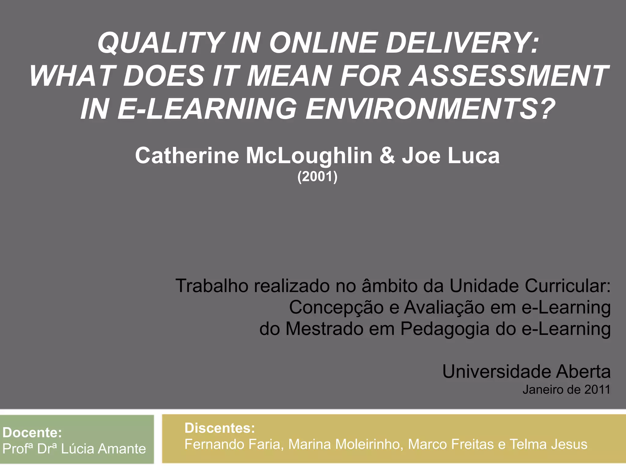 Este documento discute a qualidade na avaliação online. Aborda definições atuais de qualidade e expectativas emergentes para avaliações online adequadas. Também examina como o design instrucional, novas tecnologias e pedagogias podem melhorar as práticas de avaliação na web.