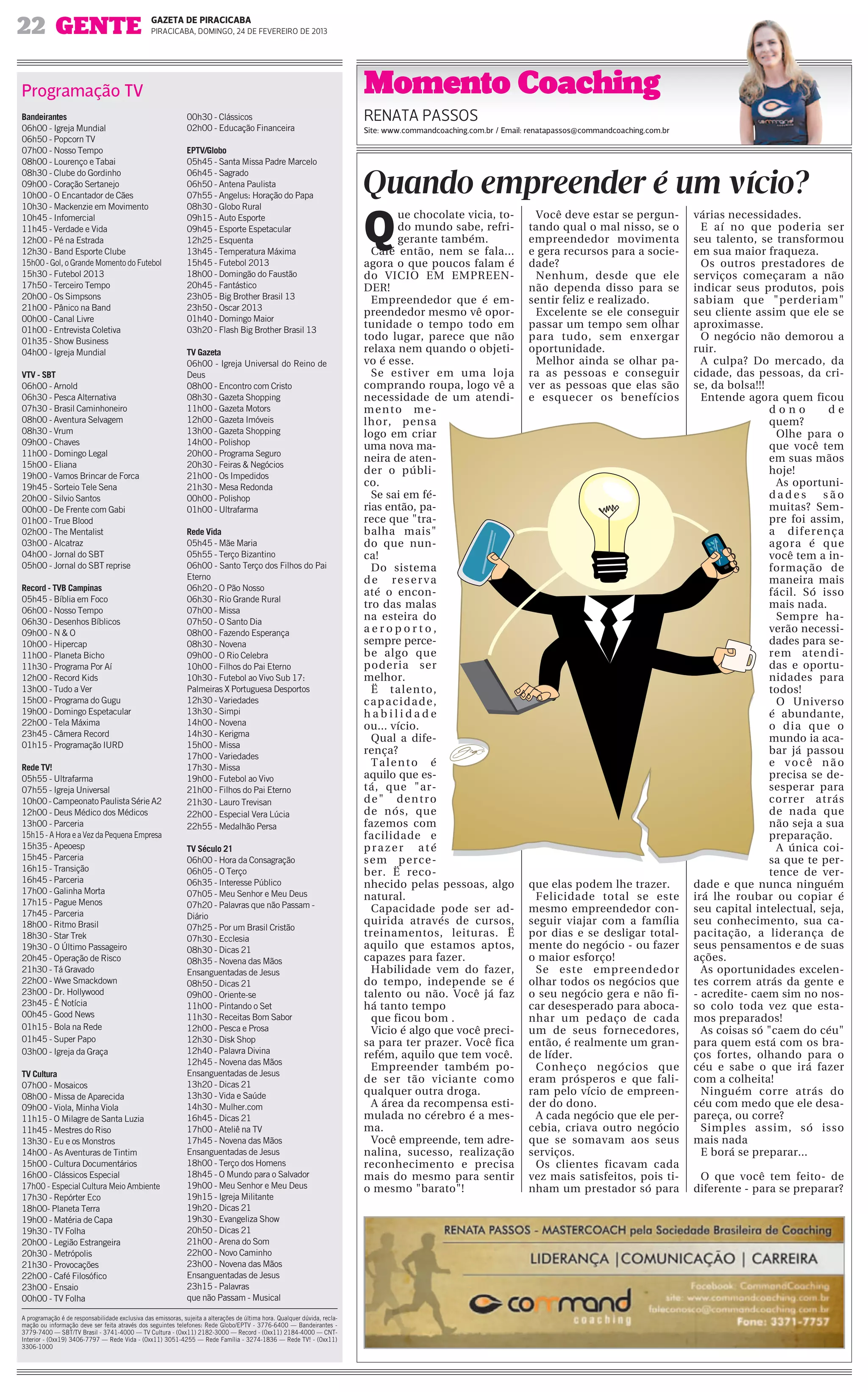 O documento fornece a programação de TV de domingo para várias emissoras de Piracicaba, incluindo shows, novelas, filmes e programas religiosos. Além disso, traz um artigo sobre os perigos de se tornar viciado no ato de empreender, dependendo demais do sucesso dos negócios para a felicidade.