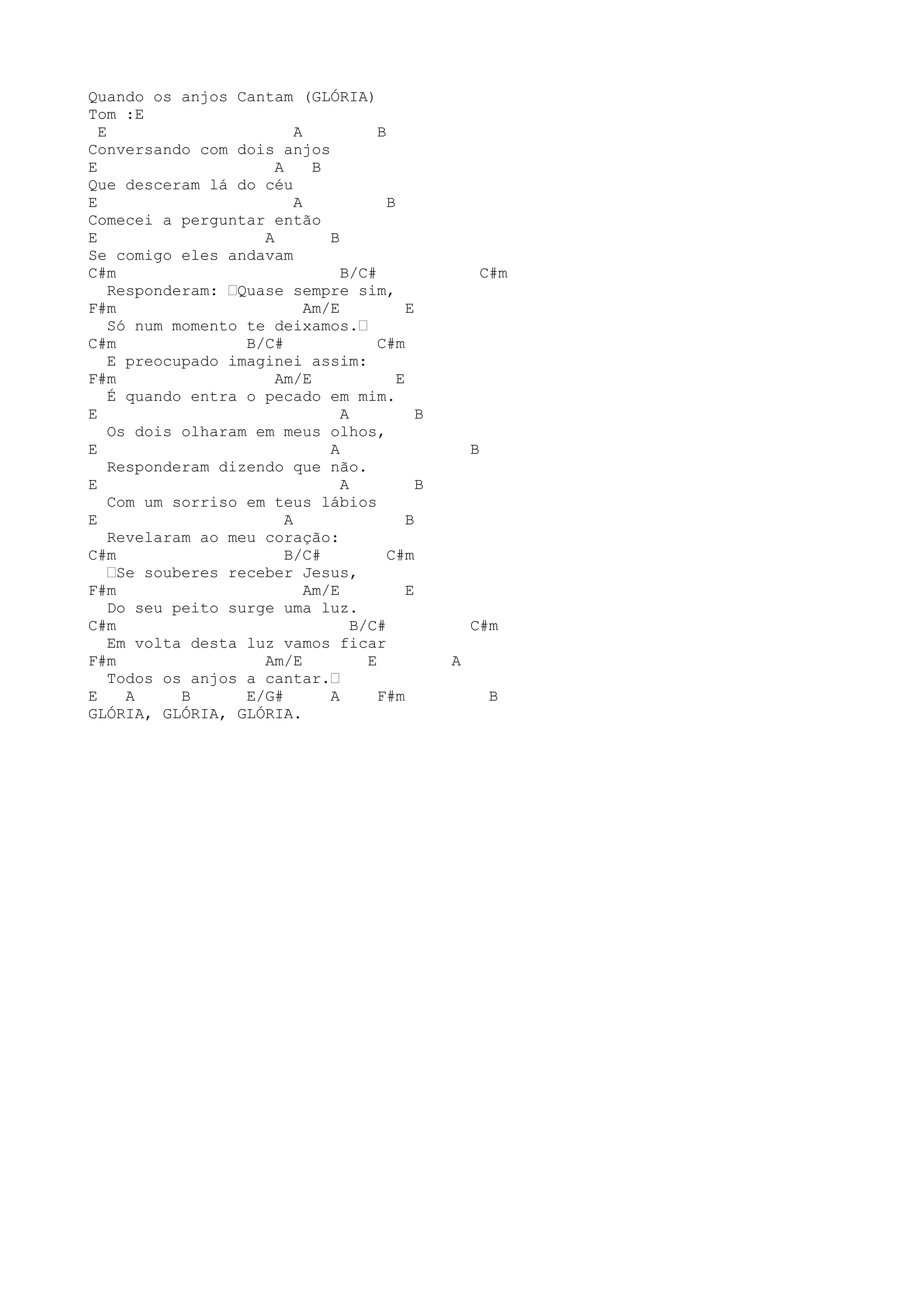 O documento é uma letra de música que descreve uma conversa com dois anjos sobre a presença deles. Os anjos explicam que eles sempre estão presentes, exceto quando o pecado entra, mas que se a pessoa receber Jesus, uma luz surgirá em seu peito e os anjos ficarão em volta dela cantando "Glória".