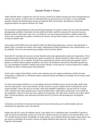 O documento discute como a aparente derrota pode levar ao verdadeiro sucesso, contando as histórias de Susan Boyle, Abraham Lincoln e Thomas Edison, que todos encontraram o sucesso após serem inicialmente rejeitados ou fracassarem. A autora argumenta que problemas na vida são inevitáveis, mas escolhemos se rendermos a eles ou não.