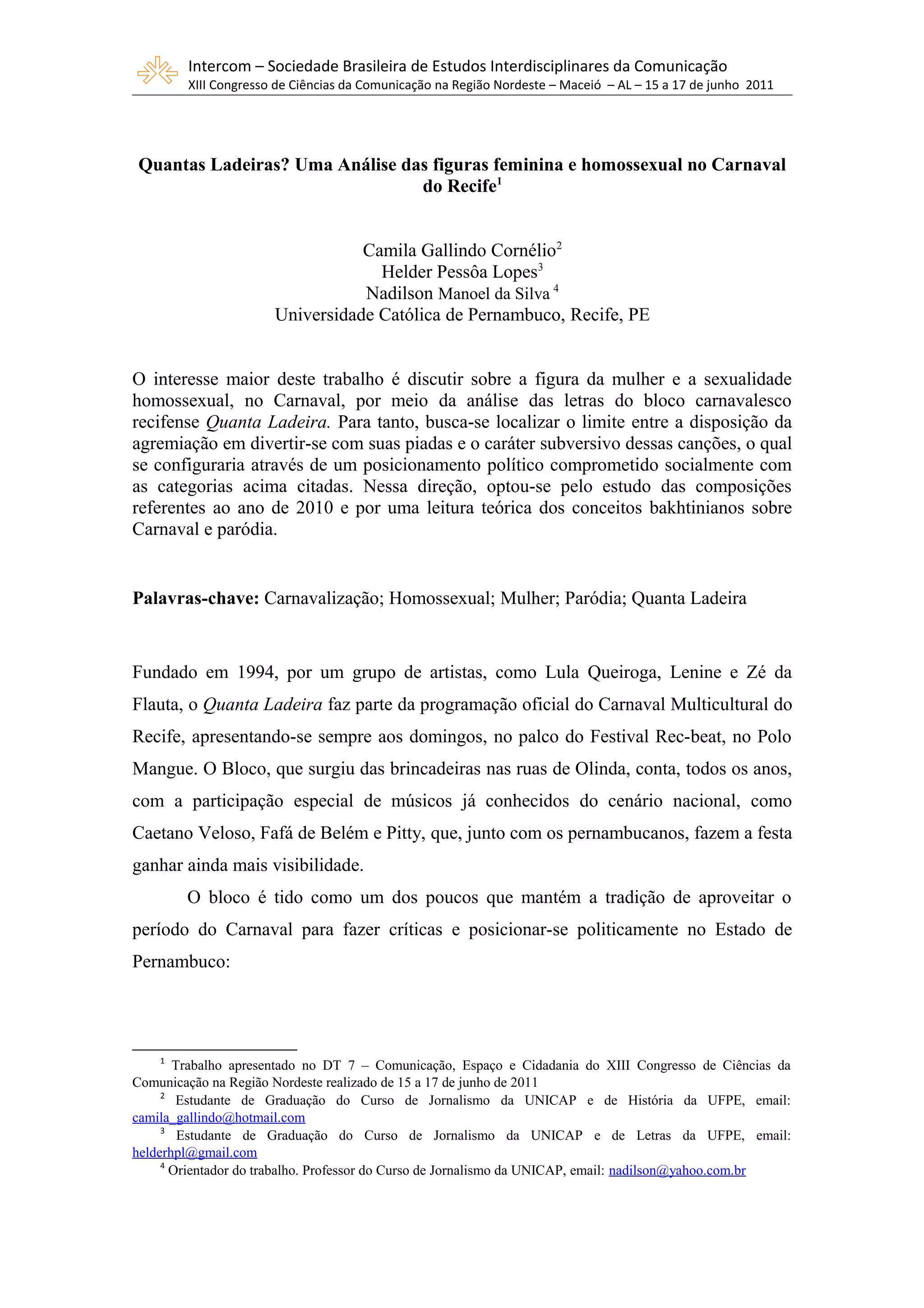 Este documento apresenta um resumo de três frases do artigo "Quantas Ladeiras? Uma Análise das figuras feminina e homossexual no Carnaval do Recife":